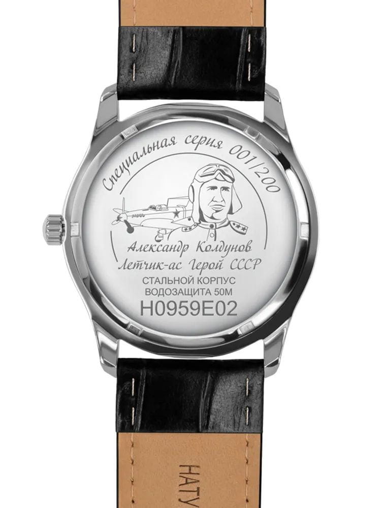 Ремешок выполнен из натуральной кожи чёрного цвета, обеспечивая комфорт при носке. Толщина корпуса составляет 11 мм, что придаёт часам солидный вид.