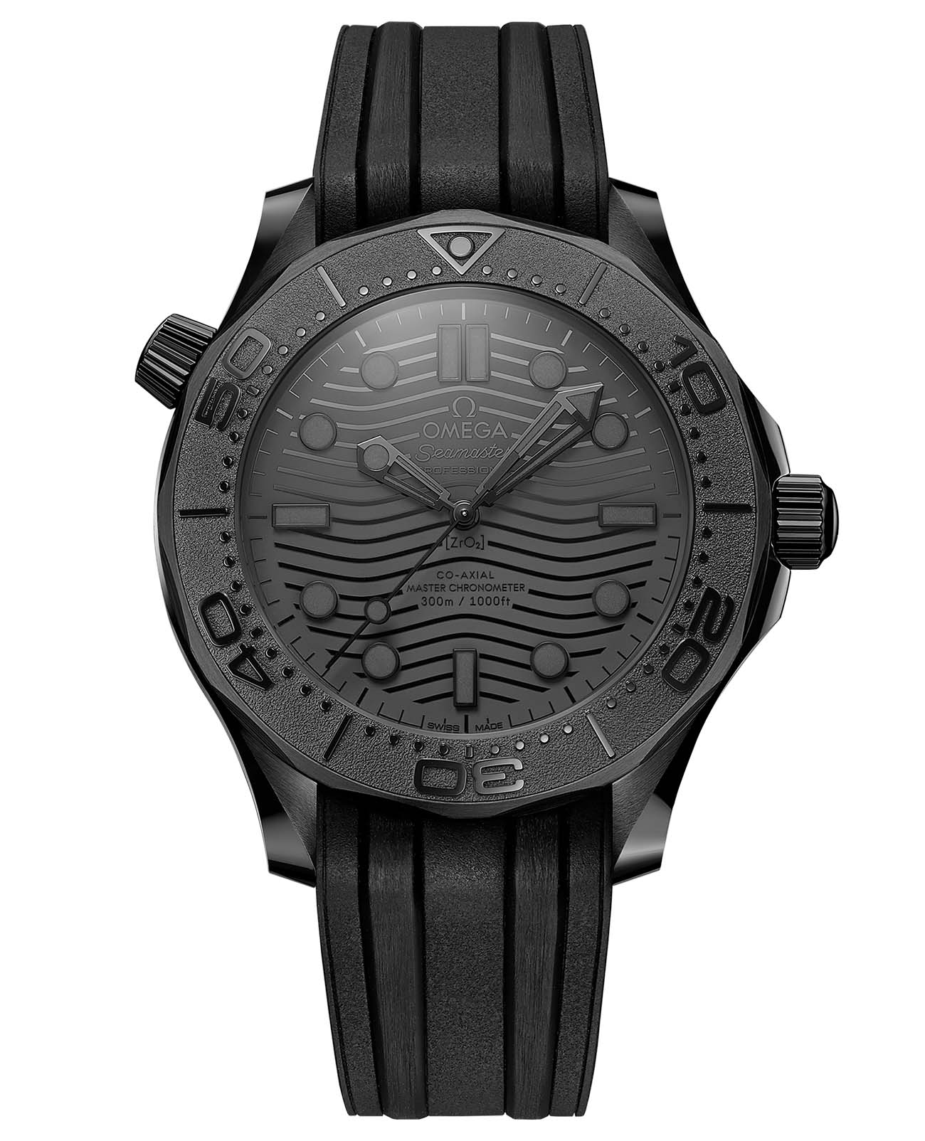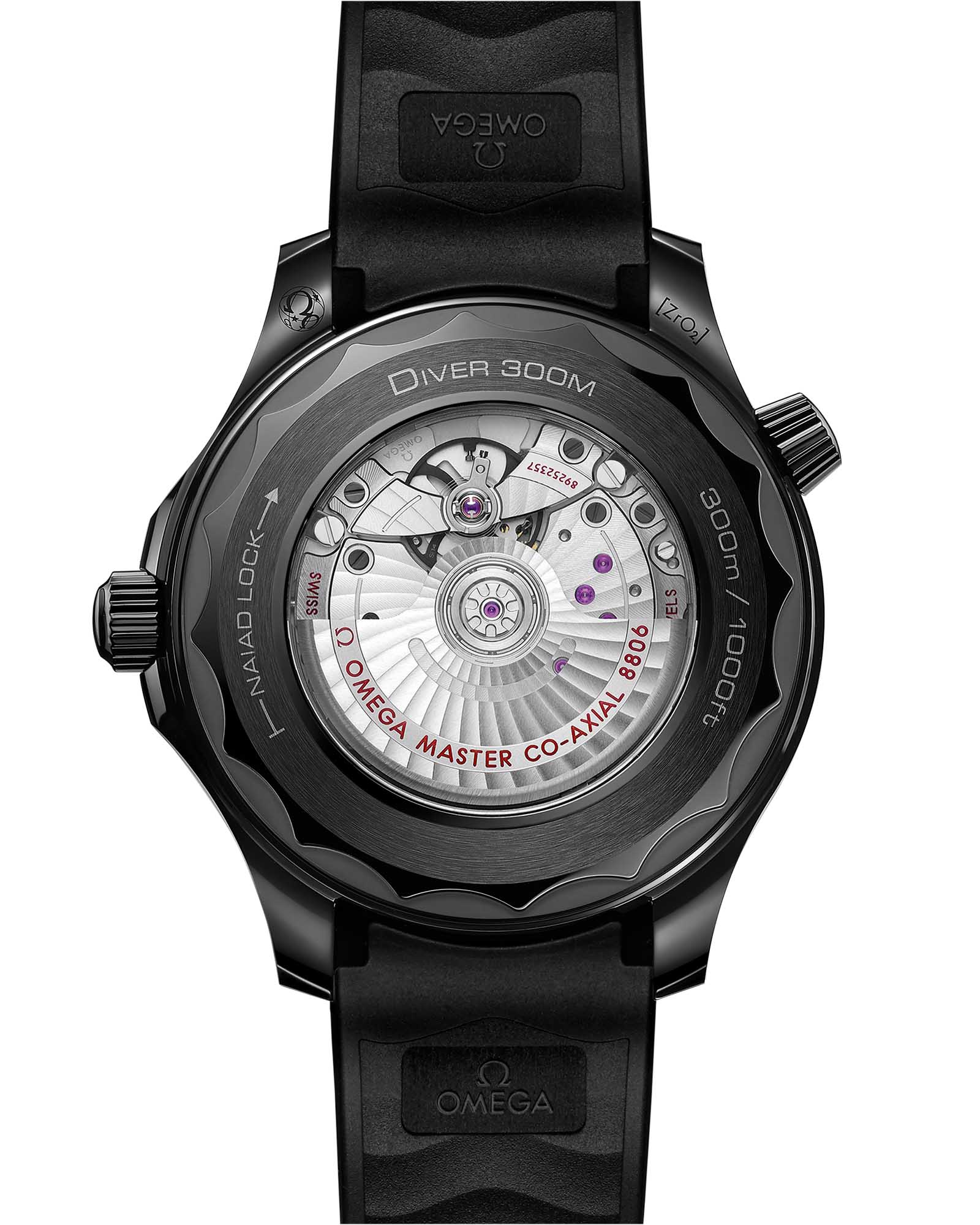 Часы Seamaster Professional Diver 300M, появившиеся на свет в 1993 году, привлекли внимание огромного количества ценителей часового искусства. Модели OMEGA 21-ого века остаются верны оригинальному дизайну дайверских часов, однако отличаются новыми высокотехнологичными материалами и механизмами. В данной модели диаметром 43,5 мм преобладает черная керамикаВысокотехнологичная керамикаИнновационный запатентованный Rado материал с гладкой или матовой поверхностью. Керамика за счёт кристаллической структуры обладает повышенной устойчивостью от возникновения царапин. Материал способен принимать температуру тела человека, обеспечивая невероятный комфорт при ношении. [ZrO2]. Корпус, безельБезельВнешний ободок, закрепляющий стекло. В спортивных часах так называется поворотное кольцо с делениями на циферблате, выполняет роль таймера – замеряет отрезки времени на шкале. Неподвижный безель – элемент декора. Однонаправленно вращающийся безель на дайверских часах позволяет фиксировать моменты погружения и выныривания на поверхность., циферблат с волнообразным узором, заводная головка и гелиевый клапан сделаны из этого превосходного материала, который придает часам эффектную графичность. Для того чтобы обеспечить видимость в ночное время, не нарушая эстетику модели, OMEGA сделала выбор в пользу антрацитового покрытия Super-LumiNovaЛюминесцентное покрытиеПозволяет считывать показания времени в темноте. Производители наносят на стрелки, часовые индексы, безель или поверхность циферблата светонакопительный состав, дающий холодное свечение. на дайверской шкале, а также черного PVD-покрытияPVDУльтратонкое покрытие наносится в технике вакуумного напыления, сочетает в себе нитрид титана особой прочности со слоем золота или оксида хрома. Несёт в себе декоративную или защитную функцию. на часовых метках, скелетонизированных стрелках и точке в положении «12 часов». Изделие дополнено интегрированным каучуковым ремешком и керамической застежкой черного цвета. Скелетонизированный корпус добавляет внешнему виду часов светлый акцент. Заднюю крышку с волнистым краем украшает сапфировое стеклоСапфировое стеклоПрочный и надёжный материал из кристалла сапфира синтетического происхождения, характеризующийся особой твёрдостью и устойчивостью к царапинам и повреждениям., сквозь которое виден калибр OMEGA Co-Axial Master Chronometer 8806."