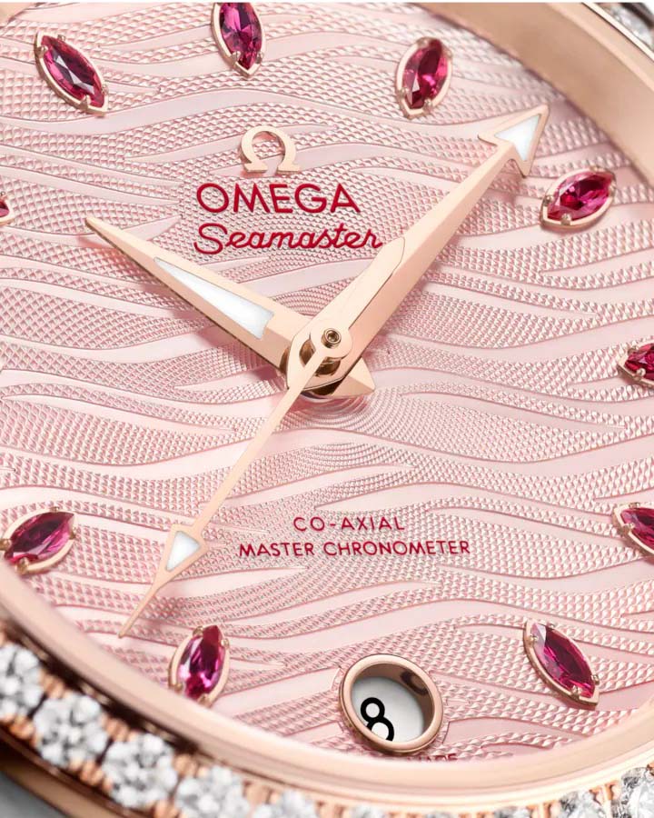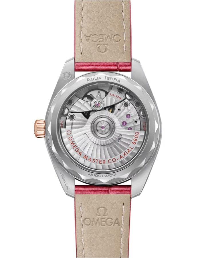 Женские часы Omega Seamaster Aqua Terra выполнены в симметричном корпусе из нержавеющей стали и 18K Sedna™ золота с завинчивающейся задней крышкой, украшенной волновым узором. Безель полированный и инкрустирован бриллиантами, что подчеркивает их роскошный дизайн. Циферблат нежно-розового цвета имеет текстуру в виде волн, окошко даты на 6 часах и 11 часовых меток в виде рубинов маркизной огранки. Стрелки выполнены из 18K Sedna™ золота с алмазной полировкой и оснащены люминесцентным покрытиемЛюминесцентное покрытиеПозволяет считывать показания времени в темноте. Производители наносят на стрелки, часовые индексы, безель или поверхность циферблата светонакопительный состав, дающий холодное свечение. для лучшей читаемости в темноте. Калибр Omega 8800 сертифицирован как Master Chronometer — гарантия высочайшей точности и устойчивости к магнитным полям. Запас хода составляет 55 часов. Защиту циферблата обеспечивает сапфировое стеклоСапфировое стеклоПрочный и надёжный материал из кристалла сапфира синтетического происхождения, характеризующийся особой твёрдостью и устойчивостью к царапинам и повреждениям. с антибликовым покрытиемАнтибликовое покрытиеСлой оксида металла в 0,13-0,3 микрон, благодаря которому стекло часов не бликует и не отражает свет. Антибликовое покрытие уменьшает отражение света в 10 раз, обеспечивая отличную читаемость показателей циферблата. с обеих сторон. Водозащита позволяет использовать часы в воде без риска повреждения. Часы установлены на кожаный ремешок красного цвета. Вес модели — около 65 грамм. Это сочетание премиального качества, технологичности и классического дизайна.