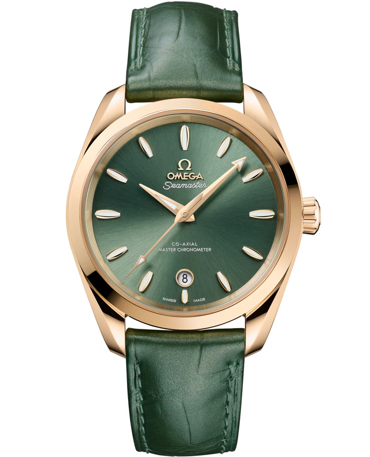 Omega Seamaster Aqua Terra выполнены в симметричном корпусе из полированного 18K Moonshine™ золота с завинчивающейся задней крышкой, украшенной волновым узором. Циферблат дополнен окошком даты на 6 часах, окаймлённым кольцом из 18K Moonshine™ золота. Стрелки и метки выполнены из 18K Moonshine™ золота и оснащены люминесцентным покрытиемЛюминесцентное покрытиеПозволяет считывать показания времени в темноте. Производители наносят на стрелки, часовые индексы, безель или поверхность циферблата светонакопительный состав, дающий холодное свечение. Super-LumiNova для лучшей читаемости в темноте. Индексы выполнены в форме корпусов парусников — деталь, подчёркивающая морское наследие коллекции. Калибр Omega 8801 сертифицирован как Master Chronometer — гарантия высочайшей точности и устойчивости к магнитным полям. Запас хода составляет 55 часов. Защиту циферблата обеспечивает сапфировое стеклоСапфировое стеклоПрочный и надёжный материал из кристалла сапфира синтетического происхождения, характеризующийся особой твёрдостью и устойчивостью к царапинам и повреждениям. с антибликовым покрытиемАнтибликовое покрытиеСлой оксида металла в 0,13-0,3 микрон, благодаря которому стекло часов не бликует и не отражает свет. Антибликовое покрытие уменьшает отражение света в 10 раз, обеспечивая отличную читаемость показателей циферблата. с обеих сторон. Водозащита позволяет использовать часы в воде без риска повреждения. Часы установлены на кожаный ремешок изумрудного цвета. Это сочетание премиального качества, технологичности и классического дизайна.