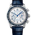 Chronoscope возрождает дух винтажных хронографов 1940-х, переосмысливая их через призму культового стиля Speedmaster. 43-мм корпус из нержавеющей стали с синим безелемБезельВнешний ободок, закрепляющий стекло. В спортивных часах так называется поворотное кольцо с делениями на циферблате, выполняет роль таймера – замеряет отрезки времени на шкале. Неподвижный безель – элемент декора. Однонаправленно вращающийся безель на дайверских часах позволяет фиксировать моменты погружения и выныривания на поверхность. из анодированного алюминия обрамляет серебристый циферблат, украшенный спиралевидным узором. Синие стрелки в форме листьев и арабские цифры создают элегантный контраст, а три исторические шкалы в форме улитки - тахиметрическая, пульсометрическая и телеметрическая - добавляют функциональности. Часы дополнены синим кожаным ремешком, подчеркивая их винтажный характер, а калибр OMEGA Co-Axial Master Chronometer 9908 обеспечивает безупречную точность, соединяя традиции с современными технологиями. На позиции "9 часов" расположен секундный счетчик, в то время как на "3 часах" удобно разместились 60-минутный и 12-часовой индикаторы.