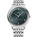 Коллекция OMEGA De Ville Prestige, не теряющая актуальности с 1994 года, предстает в третьем поколении. Часы остаются символом классического дизайна и изысканной элегантности. Модели, привлекающие внимание широкой гаммой узоров, отделок и цветов, идеально подойдут для людей с разным образом жизни и характером. Часы в корпусе диаметром 40 мм из нержавеющей стали имеют выпуклый циферблат с PVD-покрытиемPVDУльтратонкое покрытие наносится в технике вакуумного напыления, сочетает в себе нитрид титана особой прочности со слоем золота или оксида хрома. Несёт в себе декоративную или защитную функцию. оттенка зеленой сосны и радиальным сатинированием. На циферблате расположены стрелки с родиевым покрытием, а также чередующиеся римские цифры и индексы в форме кабошона. Изделие с лаконичным дизайном дополнено окошком даты в положении «6 часов» и минутной шкалой в стиле «железная дорога» на внешнем секторе. Часы с сертификатом Master Chronometer представлены с браслетом из нержавеющей стали. Модель оснащена калибром OMEGA Master Co-Axial 8800, который виден сквозь устойчивое к царапинам сапфировое стеклоСапфировое стеклоПрочный и надёжный материал из кристалла сапфира синтетического происхождения, характеризующийся особой твёрдостью и устойчивостью к царапинам и повреждениям. задней крышки корпуса.