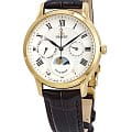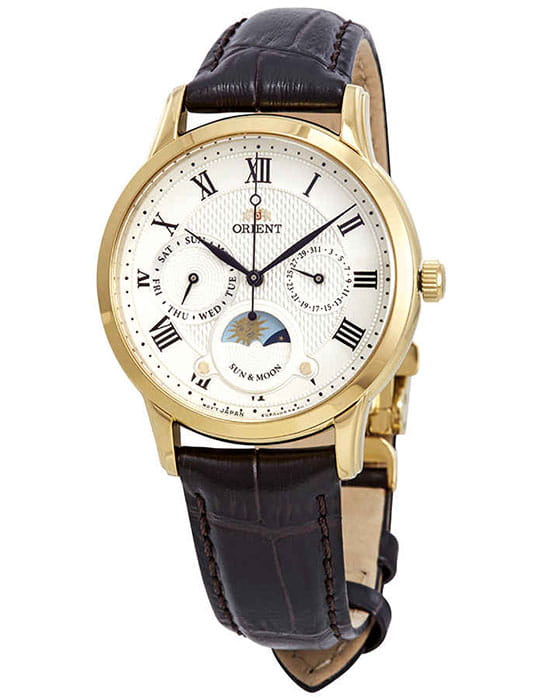 Наручные часы являются отражением винтажного стиля, гильошированный белый циферблат дополнен тонкими римскими цифрами, изысканности придаёт классический чёрный ремешок из натуральной кожи. Уникальность модели в нижнем окошке с изображением луны и солнца, так дизайнеры красиво преподносят нам смену дня и ночи. Кварцевый высокоточный калибр Orient KUE00. Сапфировое стекло. Водозащита до 5 бар. Корпус из хирургической стали 316L с цветным PVD-финишемPVDУльтратонкое покрытие наносится в технике вакуумного напыления, сочетает в себе нитрид титана особой прочности со слоем золота или оксида хрома. Несёт в себе декоративную или защитную функцию. золотистого оттенка. Отображение числа и дня недели. Диаметр корпуса: 43,8 мм.
