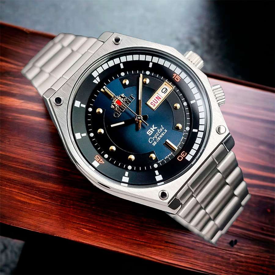 Мужские механические часы с автоподзаводом Orient — это стильный и надёжный аксессуар. Корпус диаметром 42 мм выполнен из нержавеющей стали. Циферблат синего цвета оформлен точками и стрелками. Присутствуют окошки для отображения дня недели и даты в положении 3 часов. Стрелки и метки с люминесцентным покрытиемЛюминесцентное покрытиеПозволяет считывать показания времени в темноте. Производители наносят на стрелки, часовые индексы, безель или поверхность циферблата светонакопительный состав, дающий холодное свечение., обеспечивающим хорошую читаемость в темноте. Циферблат защищён минеральным стекломМинеральное стеклоМинеральное стекло представляет собой искусственно выращенный минерал кварца. Такое стекло отличается особой устойчивостью к повреждениям и царапинам. Уступает по некоторым качествам сапфировому стеклу.. Механизм — японский автоматический калибр F6922 с 22 камнями, частотой 21600 полуколебаний в час и запасом хода 40 часов. Функция stop-second позволяет точно выставить время. Задняя крышка завинчивающаяся. Часы оснащены стальным браслетом на раскладной застёжкеРаскладная застёжкаТакой тип застёжки используется только на браслетах из металла. Она никогда не раскрывается полностью, происходит разделение на 2 и более частей. Раскладывающая застёжка снизит вероятность потери часов к минимуму.. Водонепроницаемость 50 м позволяет использовать часы при мытье рук или в дождь. Идеальный выбор для тех, кто ценит японское качество и универсальный дизайн.