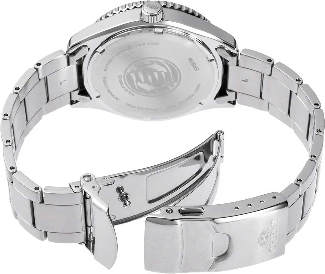 Мужские часы Orient RA-WJ0004Y1 выполнены в классическом спортивном стиле и оснащены функцией Tough SolarTough SolarТехнология основана на подзарядке аккумулятора от источника солнечного света, специальная панель улавливает солнечные лучи и преобразует их в энергию для работы часов. Достаточно пары минут нахождения на солнце для функционирования часов в течении суток., которая позволяет питаться от солнечной энергии и сохранять заряд до 12 месяцев при полной зарядке. Циферблат оформлен с использованием технологии Sunray (солнечные лучи), обеспечивая эффектный визуальный блеск. Метки в виде штрихов и арабских цифр, а также стрелки имеют люминесцентное покрытиеЛюминесцентное покрытиеПозволяет считывать показания времени в темноте. Производители наносят на стрелки, часовые индексы, безель или поверхность циферблата светонакопительный состав, дающий холодное свечение. для отличной читаемости в темноте после кратковременного освещения. Окошко даты расположено в положении 3 часов. Корпус изготовлен из стали, задняя крышка и заводная головка — завинчивающиеся, что обеспечивает высокий уровень защиты. Часы оснащены вращающимся в одном направлении безелем с алюминиевой вставкой, который удобен при подсчёте времени. Защиту циферблата обеспечивает сапфировое стеклоСапфировое стеклоПрочный и надёжный материал из кристалла сапфира синтетического происхождения, характеризующийся особой твёрдостью и устойчивостью к царапинам и повреждениям., устойчивое к царапинам и повреждениям. Водозащита позволяет использовать часы даже при активных водных занятиях. Часы установлены на стальной браслет с раскладной застёжкойРаскладная застёжкаТакой тип застёжки используется только на браслетах из металла. Она никогда не раскрывается полностью, происходит разделение на 2 и более частей. Раскладывающая застёжка снизит вероятность потери часов к минимуму. и системой блокировки, обеспечивающей надёжную фиксацию на руке. Это сочетание технологичности, прочности и эргономики для уверенных в себе людей.