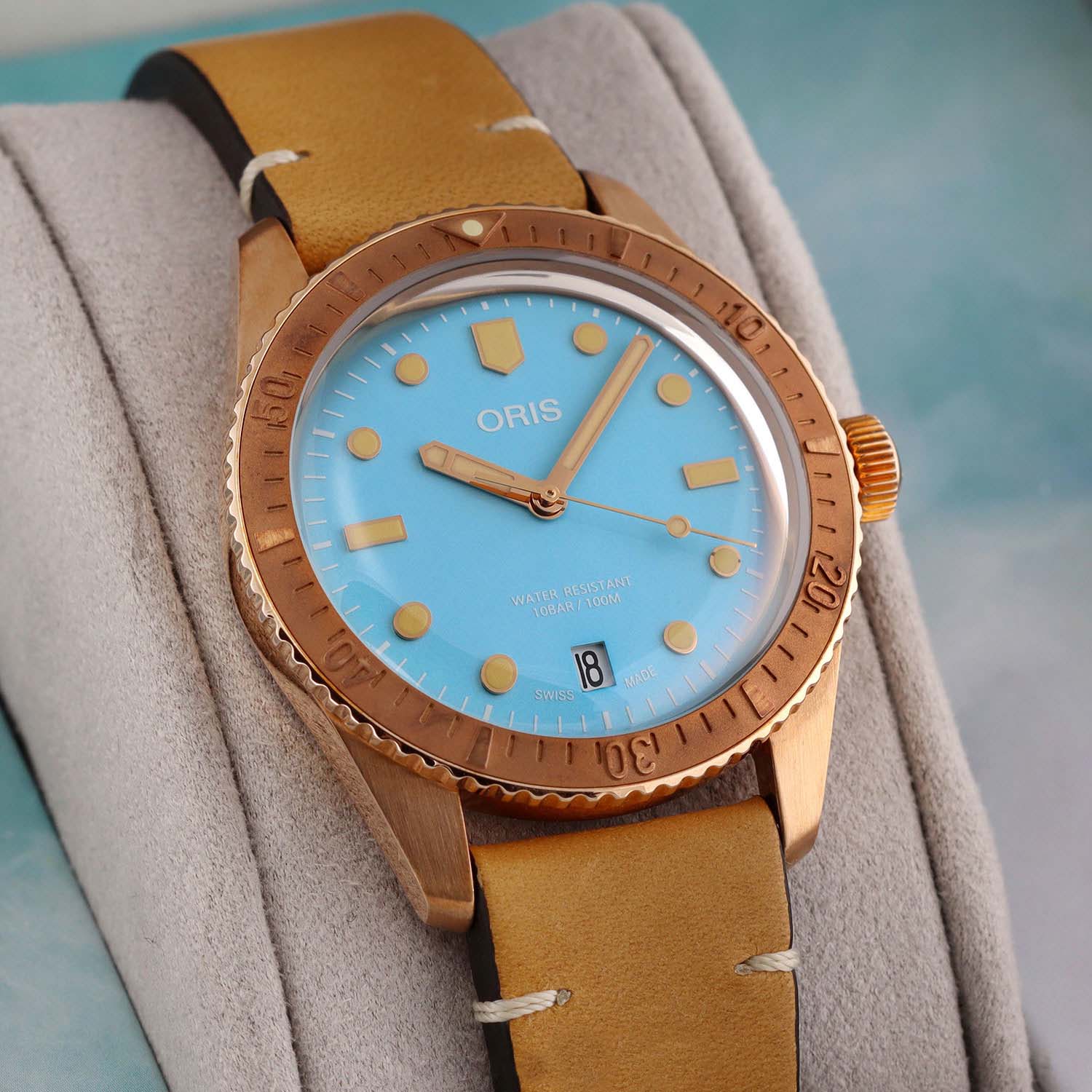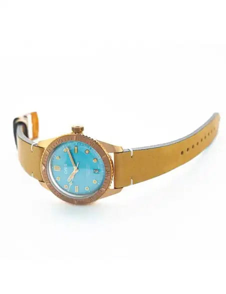 Часы Divers Sixty-Five "Cotton Candy" - это маяк радости. Корпус, безель, заводная головка полностью выполнены из бронзы, а циферблат окрашен в яркие цвета. Часы в 38-миллиметровом корпусе унисекс оснащены механизмом Swiss Made. Эти часы символизируют оптимизм и лучшие времена.