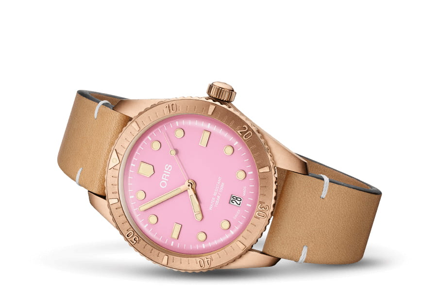 Часы Divers Sixty-Five "Cotton Candy" - это маяк радости. Корпус, безель, заводная головка полностью выполнены из бронзы, а циферблат окрашен в яркие цвета. Часы в 38-миллиметровом корпусе унисекс оснащены механизмом Swiss Made. Эти часы символизируют оптимизм и лучшие времена.