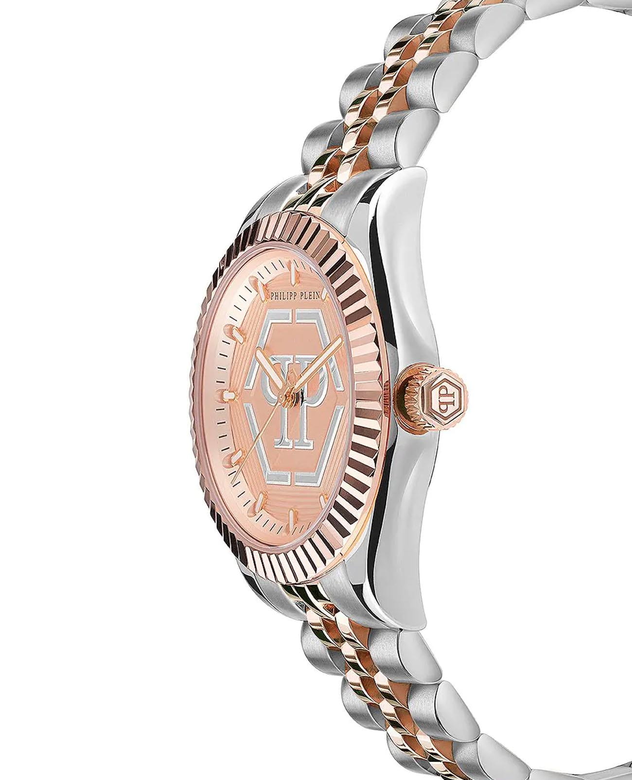 Стильные женские часы Philipp Plein Street Couture PW2BA0423 с надежным кварцевым механизмом. Корпус часов изготовлен из нержавеющей стали. Минеральное стеклоМинеральное стеклоМинеральное стекло представляет собой искусственно выращенный минерал кварца. Такое стекло отличается особой устойчивостью к повреждениям и царапинам. Уступает по некоторым качествам сапфировому стеклу. устойчивое к мелким механическим повреждениям. Влагозащита: 50 метров, позволит защитить корпус от случайных брызг или капель дождя. Стрелки и метки с люминесцентным покрытиемЛюминесцентное покрытиеПозволяет считывать показания времени в темноте. Производители наносят на стрелки, часовые индексы, безель или поверхность циферблата светонакопительный состав, дающий холодное свечение.. Стальной браслет на застёжке-бабочке с кнопкамиЗастёжка "бабочка"Такой вид застёжки дополняется предохранителями, помогающими избежать случайного раскрытия браслета. Обладают изящным исполнением. . БезельБезельВнешний ободок, закрепляющий стекло. В спортивных часах так называется поворотное кольцо с делениями на циферблате, выполняет роль таймера – замеряет отрезки времени на шкале. Неподвижный безель – элемент декора. Однонаправленно вращающийся безель на дайверских часах позволяет фиксировать моменты погружения и выныривания на поверхность. с IP-покрытиемIP-покрытиеМетод ионного напыления. Демонстрирует повышенную устойчивость к истиранию, окислению и химическим веществам. Под воздействием высокого давления и температуры около 1500°C молекулы металла надёжно соединяются с частицами корпуса часов..