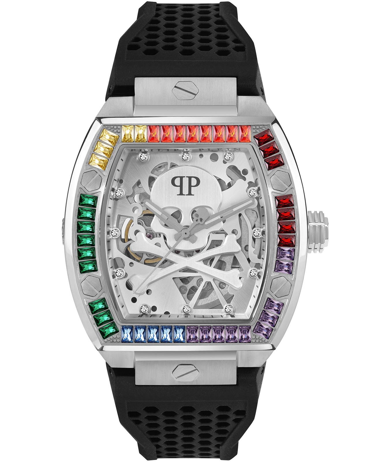 Мужские механические часы-скелетоны Philipp Plein The Skeleton PWBAA1423. Корпус часов изготовлен из нержавеющей стали. Минеральное стеклоМинеральное стеклоМинеральное стекло представляет собой искусственно выращенный минерал кварца. Такое стекло отличается особой устойчивостью к повреждениям и царапинам. Уступает по некоторым качествам сапфировому стеклу. устойчивое к мелким механическим повреждениям. Влагозащита: 50 метров, позволит защитить корпус от случайных брызг или капель дождя. Стрелки с люминесцентным покрытиемЛюминесцентное покрытиеПозволяет считывать показания времени в темноте. Производители наносят на стрелки, часовые индексы, безель или поверхность циферблата светонакопительный состав, дающий холодное свечение.. Практичный ремешок из силикона на стандартной застёжке. БезельБезельВнешний ободок, закрепляющий стекло. В спортивных часах так называется поворотное кольцо с делениями на циферблате, выполняет роль таймера – замеряет отрезки времени на шкале. Неподвижный безель – элемент декора. Однонаправленно вращающийся безель на дайверских часах позволяет фиксировать моменты погружения и выныривания на поверхность. и циферблат инкрустированы цветными кристаллами Preciosa.