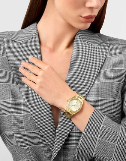 Женские кварцевые часы Philipp Plein Plein Icon Chain PW1FA0425 — это стильное сочетание элегантности и современного дизайна. Изящный корпус выполнен из нержавеющей стали с PVD-покрытиемPVDУльтратонкое покрытие наносится в технике вакуумного напыления, сочетает в себе нитрид титана особой прочности со слоем золота или оксида хрома. Несёт в себе декоративную или защитную функцию. золотистого цвета, диаметром 36 мм, что придаст образу женственности и романтизма. Изысканный циферблат с метками в виде штрихов придает модели особый блеск. Циферблат защищен минеральным стекломМинеральное стеклоМинеральное стекло представляет собой искусственно выращенный минерал кварца. Такое стекло отличается особой устойчивостью к повреждениям и царапинам. Уступает по некоторым качествам сапфировому стеклу., обеспечивающий устойчивость к царапинам и украшен кристаллами. Стрелки с люминесцентным покрытиемЛюминесцентное покрытиеПозволяет считывать показания времени в темноте. Производители наносят на стрелки, часовые индексы, безель или поверхность циферблата светонакопительный состав, дающий холодное свечение.. Часы оснащены надежным кварцевым механизмом. Стальной браслет с PVD-покрытиемPVDУльтратонкое покрытие наносится в технике вакуумного напыления, сочетает в себе нитрид титана особой прочности со слоем золота или оксида хрома. Несёт в себе декоративную или защитную функцию. на застёжке-бабочкеЗастёжка "бабочка"Такой вид застёжки дополняется предохранителями, помогающими избежать случайного раскрытия браслета. Обладают изящным исполнением. , гарантирует комфортное и безопасное ношение. Класс водозащиты: 50 метров позволит защитить корпус от случайных брызг или капель дождя. Phlipp Plein — отличный выбор для тех, кто ценит яркость и качество.