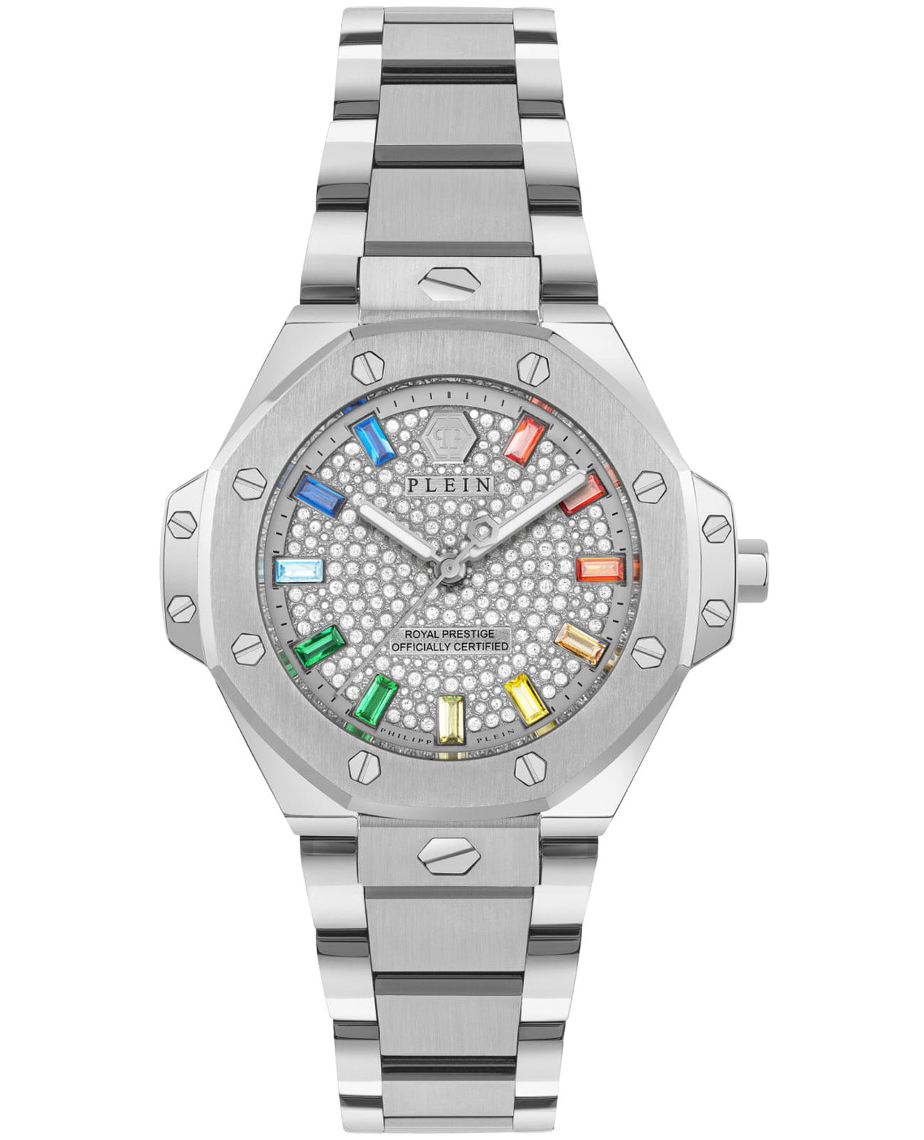 Женские кварцевые часы Philipp Plein Plein Royal Prestige PW4FA0425 — это стильное сочетание элегантности и современного дизайна. Изящный корпус выполнен из нержавеющей стали серебристого цвета, диаметром 33 мм, что придаст образу женственности и романтизма. Изысканный циферблат с метками в виде штрихов придает модели особый блеск. Циферблат защищен минеральным стекломМинеральное стеклоМинеральное стекло представляет собой искусственно выращенный минерал кварца. Такое стекло отличается особой устойчивостью к повреждениям и царапинам. Уступает по некоторым качествам сапфировому стеклу., обеспечивающий устойчивость к царапинам. БезельБезельВнешний ободок, закрепляющий стекло. В спортивных часах так называется поворотное кольцо с делениями на циферблате, выполняет роль таймера – замеряет отрезки времени на шкале. Неподвижный безель – элемент декора. Однонаправленно вращающийся безель на дайверских часах позволяет фиксировать моменты погружения и выныривания на поверхность. украшен винтами, циферблат украшен кристаллами. Стрелки с люминесцентным покрытиемЛюминесцентное покрытиеПозволяет считывать показания времени в темноте. Производители наносят на стрелки, часовые индексы, безель или поверхность циферблата светонакопительный состав, дающий холодное свечение.. Часы оснащены надежным кварцевым механизмом. Стальной браслет на застёжке-бабочке с кнопкамиЗастёжка "бабочка"Такой вид застёжки дополняется предохранителями, помогающими избежать случайного раскрытия браслета. Обладают изящным исполнением. , гарантирует комфортное и безопасное ношение. Класс водозащиты: 50 метров позволит защитить корпус от случайных брызг или капель дождя. Phlipp Plein — отличный выбор для тех, кто ценит яркость и качество.
