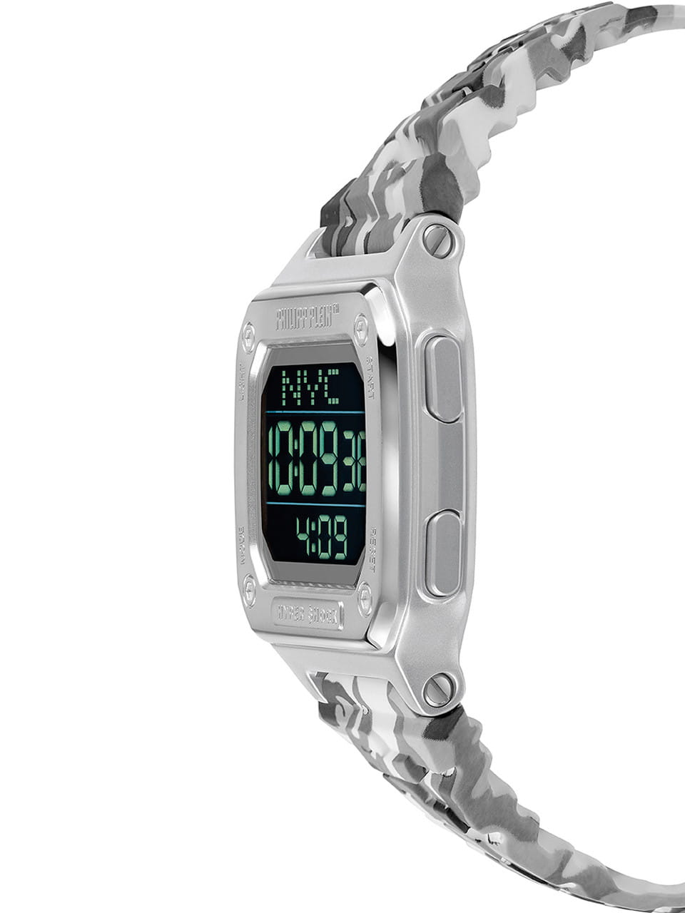 Электронные унисекс часы с секундомеромСекундомерСекундоме́р — прибор, способный измерять интервалы времени с точностью до долей секунды. Philipp Plein Hyper Shock PWHAA1522, электронный механизм с высокой точностью. Класс водозащиты: 50 метров, позволит защитить корпус от случайных брызг или капель дождя. Прямоугольный корпус выполнен из нержавеющей стали. Силиконовый ремешок цвета камуфляж (бело-серый) шириной 22 мм, стандартная застежка.