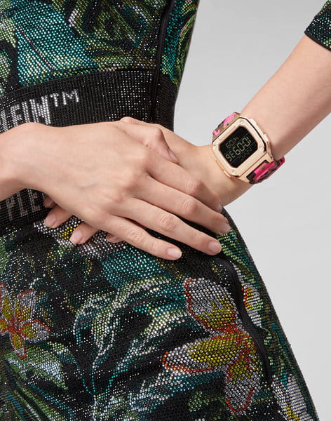 Электронные унисекс часы с секундомеромСекундомерСекундоме́р — прибор, способный измерять интервалы времени с точностью до долей секунды. Philipp Plein Hyper Shock PWHAA1622, электронный механизм с высокой точностью. Класс водозащиты: 50 метров, позволит защитить корпус от случайных брызг или капель дождя. Прямоугольный корпус выполнен из нержавеющей стали с IP-покрытиемIP-покрытиеМетод ионного напыления. Демонстрирует повышенную устойчивость к истиранию, окислению и химическим веществам. Под воздействием высокого давления и температуры около 1500°C молекулы металла надёжно соединяются с частицами корпуса часов. цвета розовое золото. Силиконовый ремешок цвета камуфляж (розово-зеленый) шириной 22 мм, стандартная застежка.