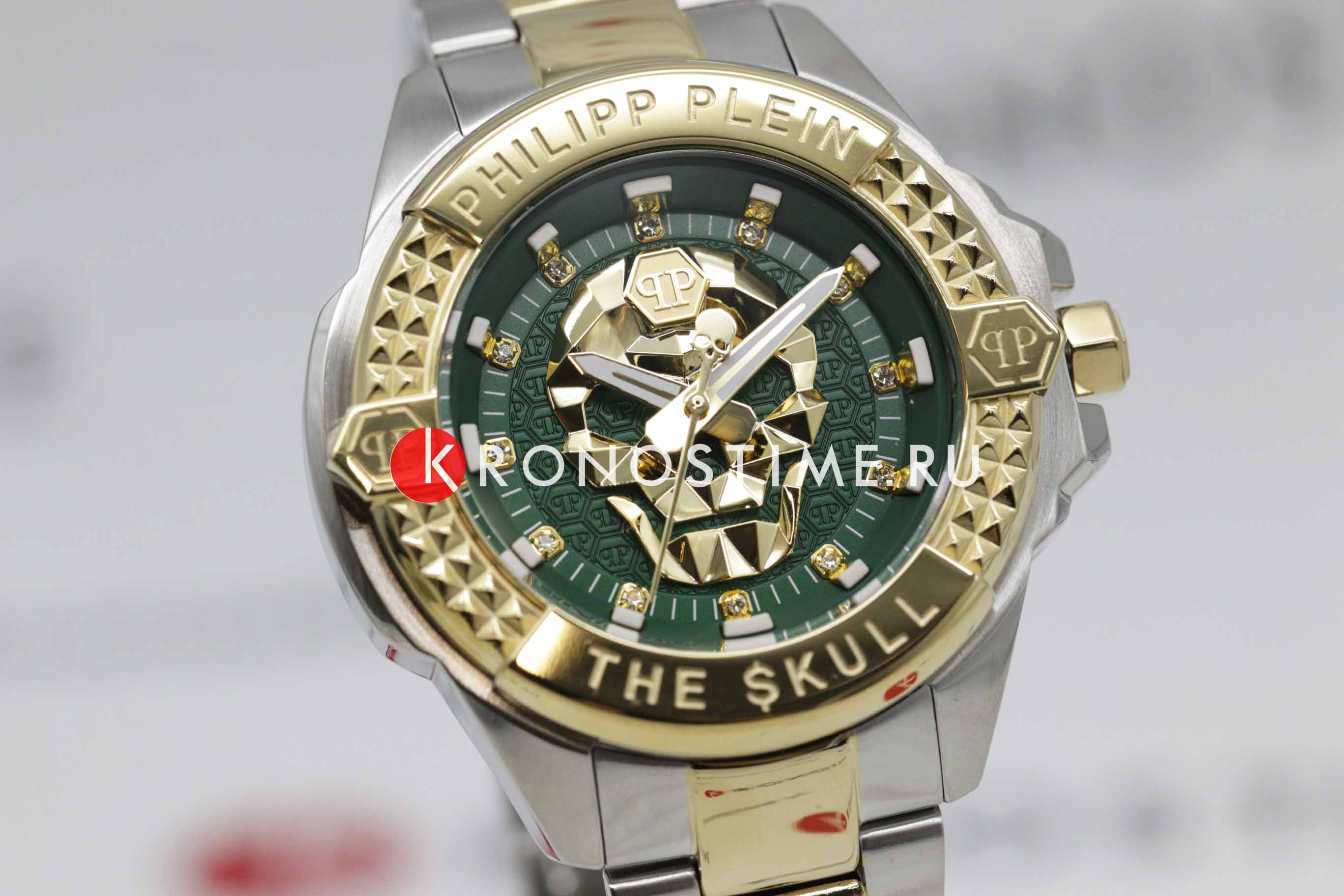Яркие унисекс часы с минеральным стекломМинеральное стеклоМинеральное стекло представляет собой искусственно выращенный минерал кварца. Такое стекло отличается особой устойчивостью к повреждениям и царапинам. Уступает по некоторым качествам сапфировому стеклу. Philipp Plein The Skull PWNAA0622, кварцевый механизм с высокой точностью. Класс водозащиты: 50 метров, позволит защитить корпус от случайных брызг или капель дождя. Корпус часов изготовлен из стали с IP-покрытиемIP-покрытиеМетод ионного напыления. Демонстрирует повышенную устойчивость к истиранию, окислению и химическим веществам. Под воздействием высокого давления и температуры около 1500°C молекулы металла надёжно соединяются с частицами корпуса часов.. Круглый стальной корпус.. Циферблат дополнен трехмерным граненым черепом. Шестигранная заводная головка с защитой. Застёжка бабочка с кнопкамиЗастёжка "бабочка"Такой вид застёжки дополняется предохранителями, помогающими избежать случайного раскрытия браслета. Обладают изящным исполнением. .