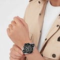 Современный стиль и безупречное исполнение сливаются в каждой детали этих брендовых часов, которые каждую секунду будут напоминать вам о ценности времени. Мужские часы-хронографХронографФункция позволяет измерять отрезки времени с особой точностью: часы, минуты, секунды. Верным признаком хронографа является наличие на циферблате 3 дополнительных окошек-счётчиков. с японским кварцевым механизмом. Круглый стальной корпус украшен знаковыми винтами. Метки в виде штрихов. Минеральное стеклоМинеральное стеклоМинеральное стекло представляет собой искусственно выращенный минерал кварца. Такое стекло отличается особой устойчивостью к повреждениям и царапинам. Уступает по некоторым качествам сапфировому стеклу. устойчивое к мелким механическим повреждениям. Фирменная дизайнерская упаковка. БезельБезельВнешний ободок, закрепляющий стекло. В спортивных часах так называется поворотное кольцо с делениями на циферблате, выполняет роль таймера – замеряет отрезки времени на шкале. Неподвижный безель – элемент декора. Однонаправленно вращающийся безель на дайверских часах позволяет фиксировать моменты погружения и выныривания на поверхность. с IP-покрытиемIP-покрытиеМетод ионного напыления. Демонстрирует повышенную устойчивость к истиранию, окислению и химическим веществам. Под воздействием высокого давления и температуры около 1500°C молекулы металла надёжно соединяются с частицами корпуса часов.. Стрелки и метки с люминесцентным покрытиемЛюминесцентное покрытиеПозволяет считывать показания времени в темноте. Производители наносят на стрелки, часовые индексы, безель или поверхность циферблата светонакопительный состав, дающий холодное свечение.. Стальной браслет с частичным IP-покрытиемIP-покрытиеМетод ионного напыления. Демонстрирует повышенную устойчивость к истиранию, окислению и химическим веществам. Под воздействием высокого давления и температуры около 1500°C молекулы металла надёжно соединяются с частицами корпуса часов. на раскладной застёжкеРаскладная застёжкаТакой тип застёжки используется только на браслетах из металла. Она никогда не раскрывается полностью, происходит разделение на 2 и более частей. Раскладывающая застёжка снизит вероятность потери часов к минимуму.. Окошко даты находится в положении между 4 и 5 часов.