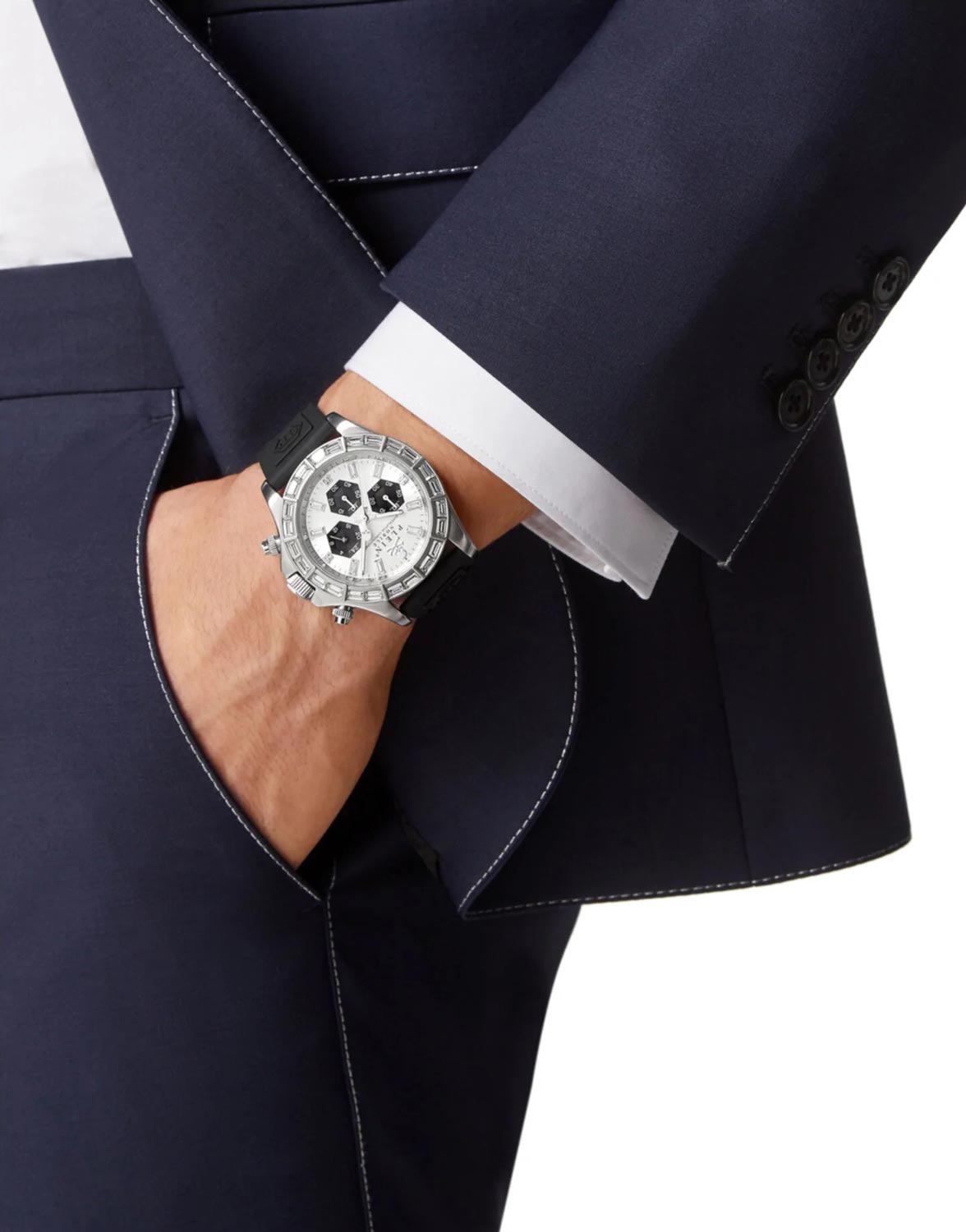Яркие мужские часы-хронографХронографФункция позволяет измерять отрезки времени с особой точностью: часы, минуты, секунды. Верным признаком хронографа является наличие на циферблате 3 дополнительных окошек-счётчиков. Philipp Plein Nobile Racing PWVAA0123 с секундомеромСекундомерСекундоме́р — прибор, способный измерять интервалы времени с точностью до долей секунды., кварцевый механизм с высокой точностью. Класс водозащиты: 50 метров, позволит защитить корпус от случайных брызг или капель дождя. Корпус часов изготовлен из стали, циферблат украшен кристаллами, защищен прочным минеральным стекломМинеральное стеклоМинеральное стекло представляет собой искусственно выращенный минерал кварца. Такое стекло отличается особой устойчивостью к повреждениям и царапинам. Уступает по некоторым качествам сапфировому стеклу..