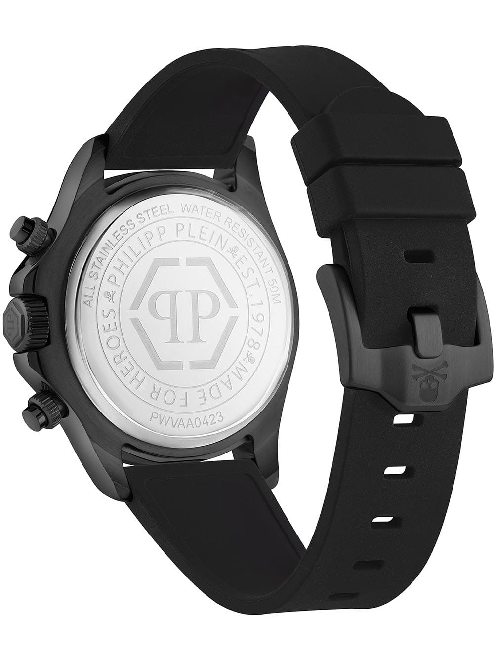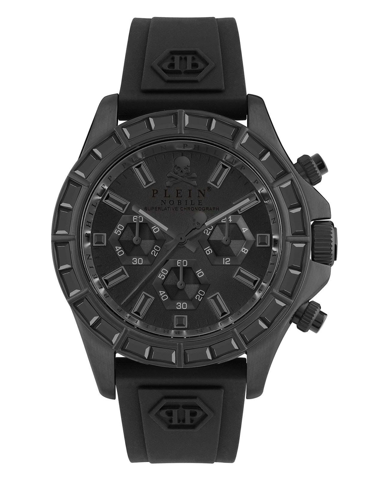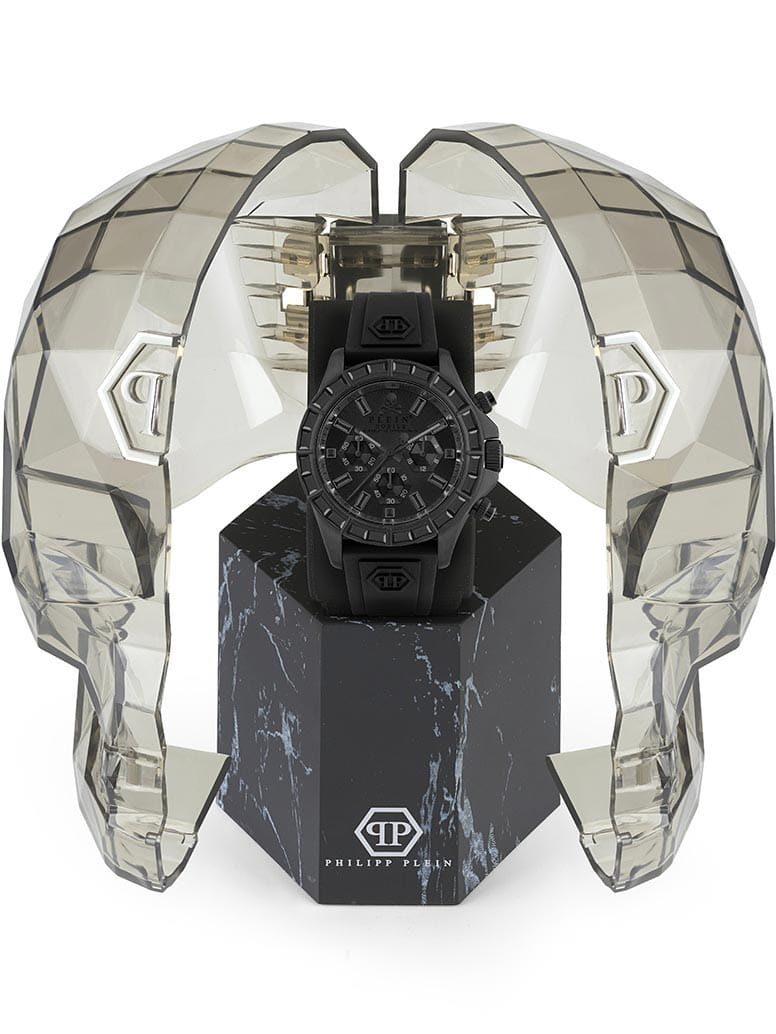 Яркие мужские часы-хронографХронографФункция позволяет измерять отрезки времени с особой точностью: часы, минуты, секунды. Верным признаком хронографа является наличие на циферблате 3 дополнительных окошек-счётчиков. Philipp Plein Nobile Racing PWVAA0423 с секундомеромСекундомерСекундоме́р — прибор, способный измерять интервалы времени с точностью до долей секунды., кварцевый механизм с высокой точностью. Класс водозащиты: 50 метров, позволит защитить корпус от случайных брызг или капель дождя. Корпус часов изготовлен из стали с IP-покрытиемIP-покрытиеМетод ионного напыления. Демонстрирует повышенную устойчивость к истиранию, окислению и химическим веществам. Под воздействием высокого давления и температуры около 1500°C молекулы металла надёжно соединяются с частицами корпуса часов., циферблат украшен кристаллами, защищен прочным минеральным стекломМинеральное стеклоМинеральное стекло представляет собой искусственно выращенный минерал кварца. Такое стекло отличается особой устойчивостью к повреждениям и царапинам. Уступает по некоторым качествам сапфировому стеклу..