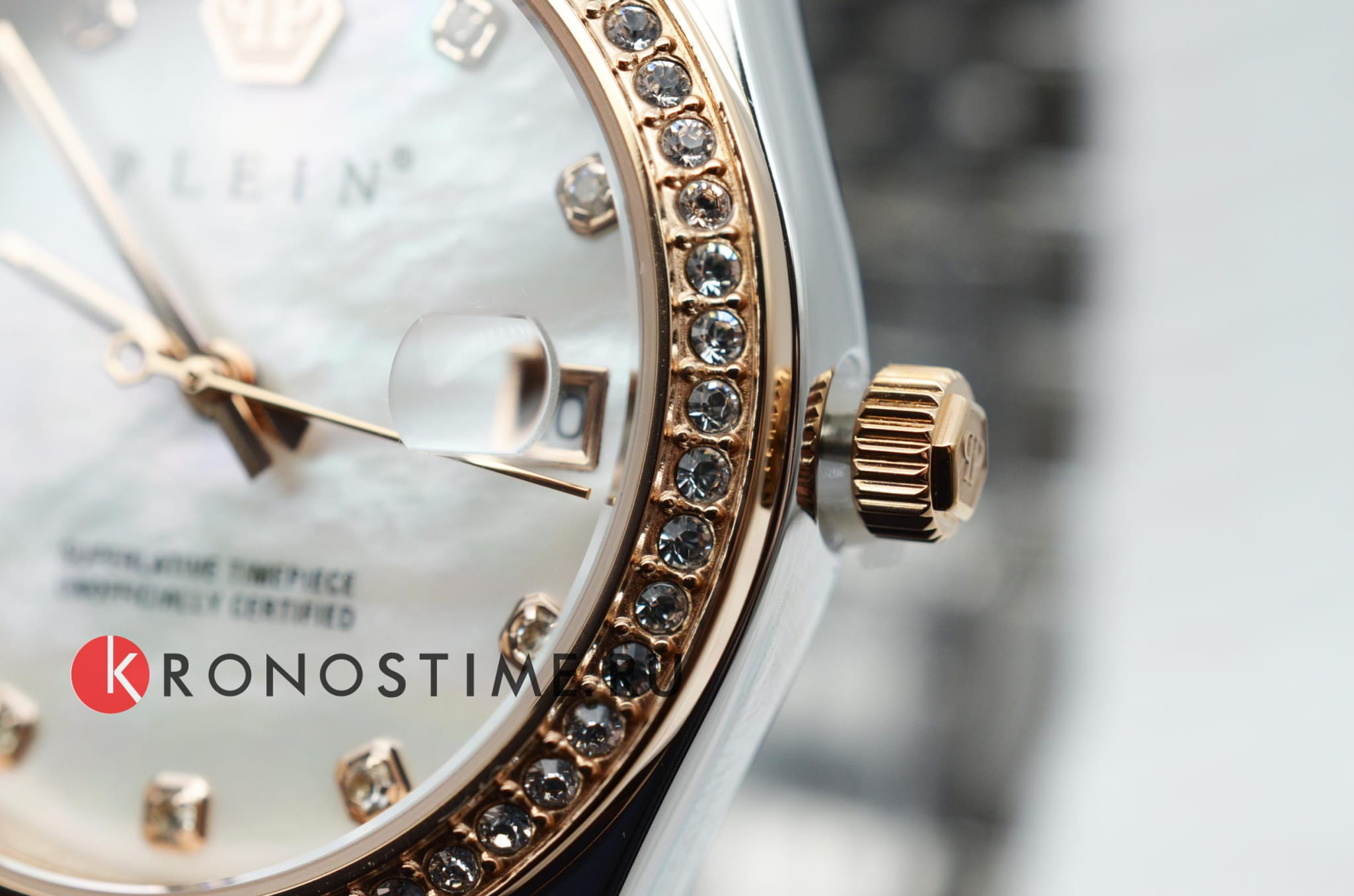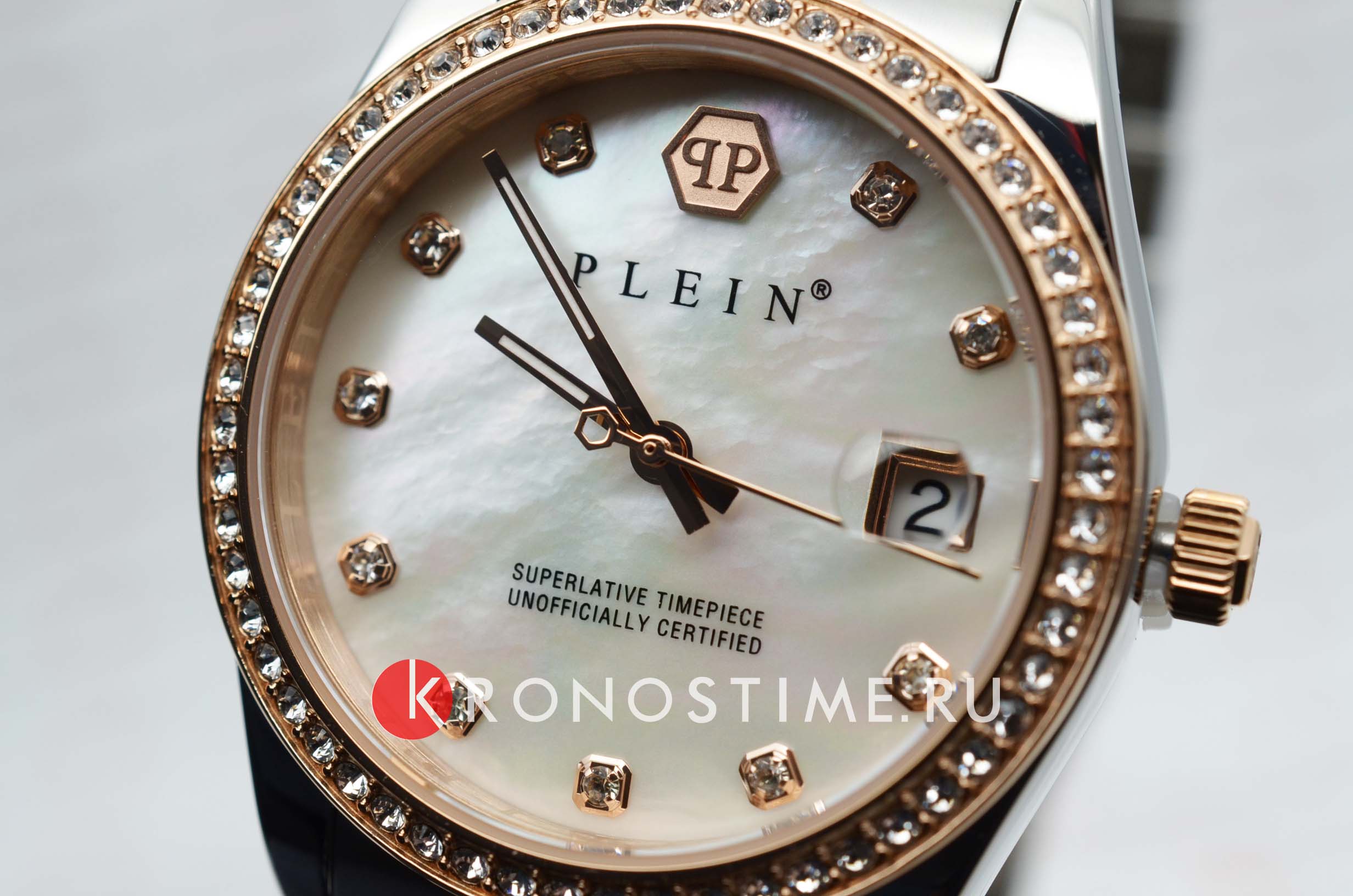 Яркие женские часы Philipp Plein Date Superlative PWYAA0223 c с минеральным стекломМинеральное стеклоМинеральное стекло представляет собой искусственно выращенный минерал кварца. Такое стекло отличается особой устойчивостью к повреждениям и царапинам. Уступает по некоторым качествам сапфировому стеклу.. Особенные часы для особенных женщин! Ослепительный аксессуар, демонстрирующий роскошь и изысканность.Часы с круглым стальным корпусом с IP-покрытиемIP-покрытиеМетод ионного напыления. Демонстрирует повышенную устойчивость к истиранию, окислению и химическим веществам. Под воздействием высокого давления и температуры около 1500°C молекулы металла надёжно соединяются с частицами корпуса часов.. Перламутровый циферблат с метками в виде точек, украшенных кристаллами. Люминесцентное покрытиеЛюминесцентное покрытиеПозволяет считывать показания времени в темноте. Производители наносят на стрелки, часовые индексы, безель или поверхность циферблата светонакопительный состав, дающий холодное свечение. стрелок. Окошко даты с увеличительным стеклом находится в положении 3 часа. Рифленая заводная головка. Стальной браслет на застёжке бабочка с кнопкамиЗастёжка "бабочка"Такой вид застёжки дополняется предохранителями, помогающими избежать случайного раскрытия браслета. Обладают изящным исполнением.