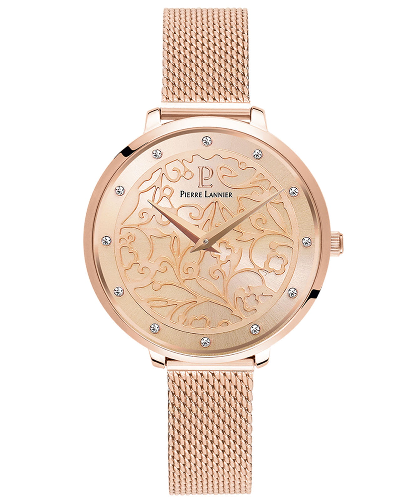 Женские кварцевые часы Pierre Lannier Eolia 041K958. Минеральное стеклоМинеральное стеклоМинеральное стекло представляет собой искусственно выращенный минерал кварца. Такое стекло отличается особой устойчивостью к повреждениям и царапинам. Уступает по некоторым качествам сапфировому стеклу. устойчивое к мелким механическим повреждениям. Центральные часовая и минутная стрелки. Корпус выполнен из нержавеющей стали с IP-покрытиемIP-покрытиеМетод ионного напыления. Демонстрирует повышенную устойчивость к истиранию, окислению и химическим веществам. Под воздействием высокого давления и температуры около 1500°C молекулы металла надёжно соединяются с частицами корпуса часов.. Водостойкость: 50 метров, позволит защитить корпус от случайных брызг или капель дождя. Стальной браслет миланского плетения с раскладной застёжкойРаскладная застёжкаТакой тип застёжки используется только на браслетах из металла. Она никогда не раскрывается полностью, происходит разделение на 2 и более частей. Раскладывающая застёжка снизит вероятность потери часов к минимуму.. Золотисто-розовый циферблат украшен кристаллами.
