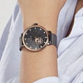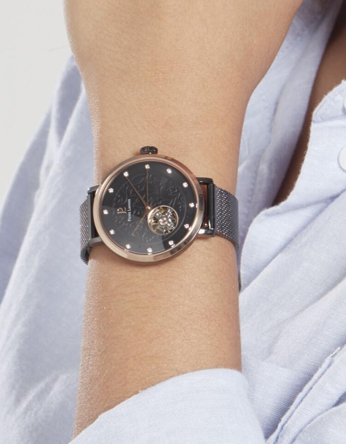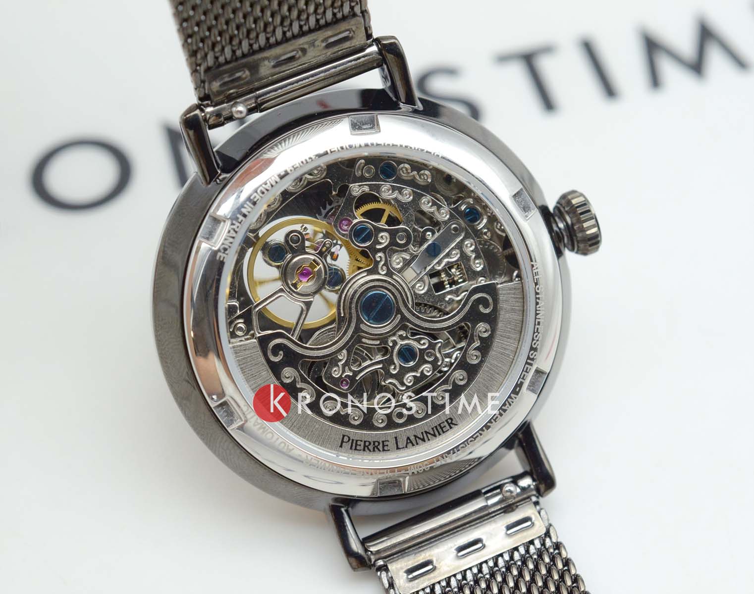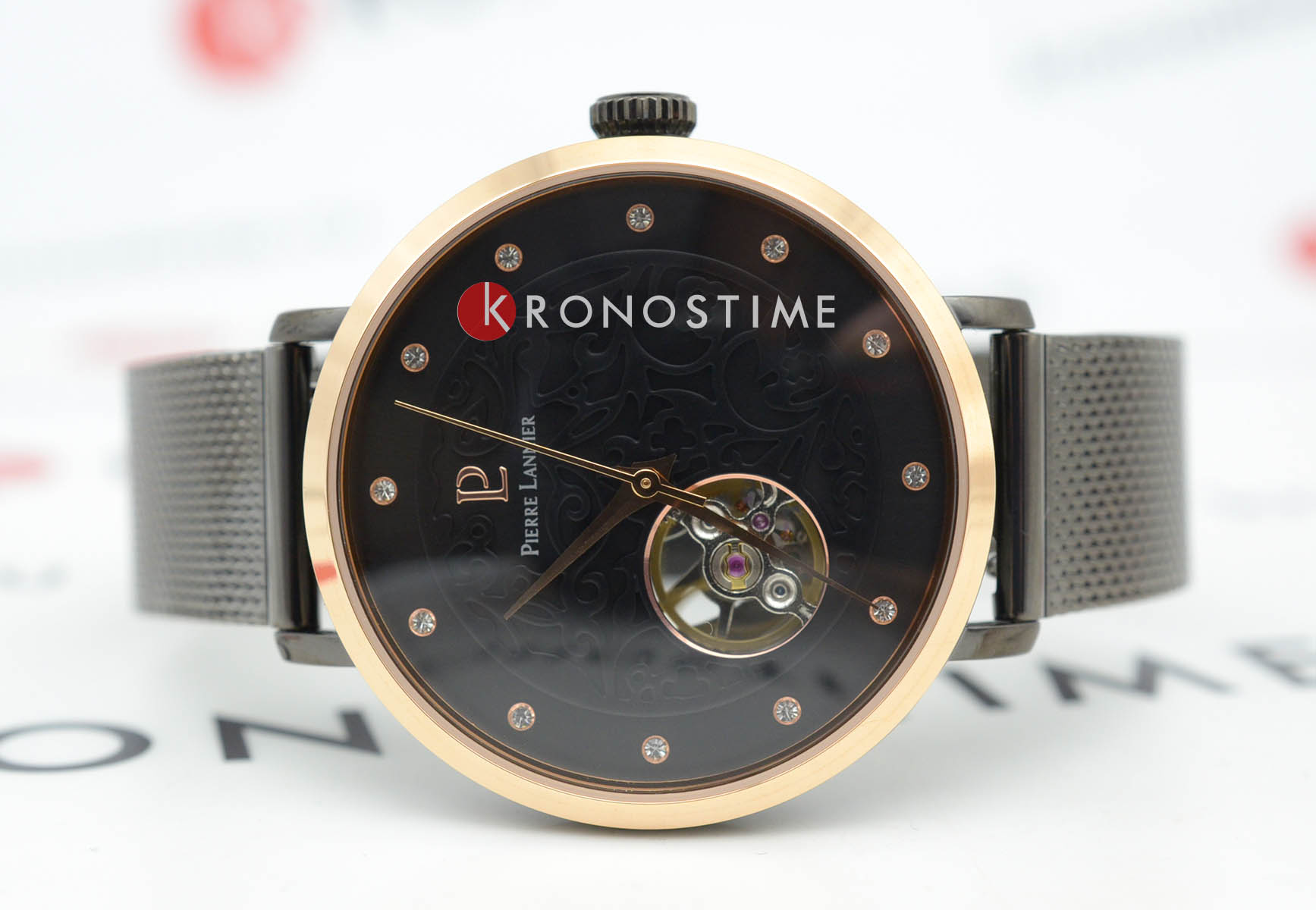Женские механические часы с автоподзаводом Pierre Lannier Eolia 310F988. Минеральное стеклоМинеральное стеклоМинеральное стекло представляет собой искусственно выращенный минерал кварца. Такое стекло отличается особой устойчивостью к повреждениям и царапинам. Уступает по некоторым качествам сапфировому стеклу. устойчивое к мелким механическим повреждениям. Центральные часовая, минутная и секундная стрелки. Черный циферблат с открытым балансом хода украшен кристаллами. Корпус и браслет выполнен из нержавеющей стали с IP-покрытиемIP-покрытиеМетод ионного напыления. Демонстрирует повышенную устойчивость к истиранию, окислению и химическим веществам. Под воздействием высокого давления и температуры около 1500°C молекулы металла надёжно соединяются с частицами корпуса часов..  Водостойкость: 30 метров, позволит защитить корпус от случайных брызг или капель дождя. Прозрачная задняя крышка. Браслет миланского плетения с раскладной застёжкойРаскладная застёжкаТакой тип застёжки используется только на браслетах из металла. Она никогда не раскрывается полностью, происходит разделение на 2 и более частей. Раскладывающая застёжка снизит вероятность потери часов к минимуму..