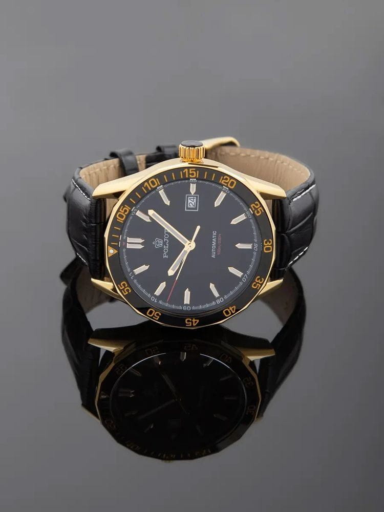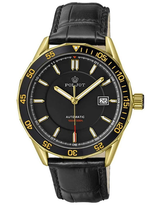 Poljot NH35A.186260 — надёжные механические мужские часы с автоподзаводом, сочетающие техническую точность и выразительный спортивный стиль. Корпус из нержавеющей стали  с PVD-покрытиемPVDУльтратонкое покрытие наносится в технике вакуумного напыления, сочетает в себе нитрид титана особой прочности со слоем золота или оксида хрома. Несёт в себе декоративную или защитную функцию. подчёркивает прочность конструкции, а насыщенный циферблат с акцентами на стрелках и метках придаёт модели динамичный и современный облик. БезельБезельВнешний ободок, закрепляющий стекло. В спортивных часах так называется поворотное кольцо с делениями на циферблате, выполняет роль таймера – замеряет отрезки времени на шкале. Неподвижный безель – элемент декора. Однонаправленно вращающийся безель на дайверских часах позволяет фиксировать моменты погружения и выныривания на поверхность. с PVD-покрытиемPVDУльтратонкое покрытие наносится в технике вакуумного напыления, сочетает в себе нитрид титана особой прочности со слоем золота или оксида хрома. Несёт в себе декоративную или защитную функцию.. Внутри установлен проверенный японский механизм SEIKO NH35, обеспечивающий стабильную работу и плавный ход секундной стрелки. Окно даты добавляет функциональности, а широкие метки с люминесцентным покрытиемЛюминесцентное покрытиеПозволяет считывать показания времени в темноте. Производители наносят на стрелки, часовые индексы, безель или поверхность циферблата светонакопительный состав, дающий холодное свечение. обеспечивают отличную читаемость даже в темноте. Прочное минеральное стеклоМинеральное стеклоМинеральное стекло представляет собой искусственно выращенный минерал кварца. Такое стекло отличается особой устойчивостью к повреждениям и царапинам. Уступает по некоторым качествам сапфировому стеклу. защищает циферблат от царапин, а ремешок из натуральной кожи с контрастной прострочкой гарантирует комфорт и надёжную посадку. Poljot — часы с характером, созданные для тех, кто ценит точность, качество и спортивную уверенность в каждой детали.