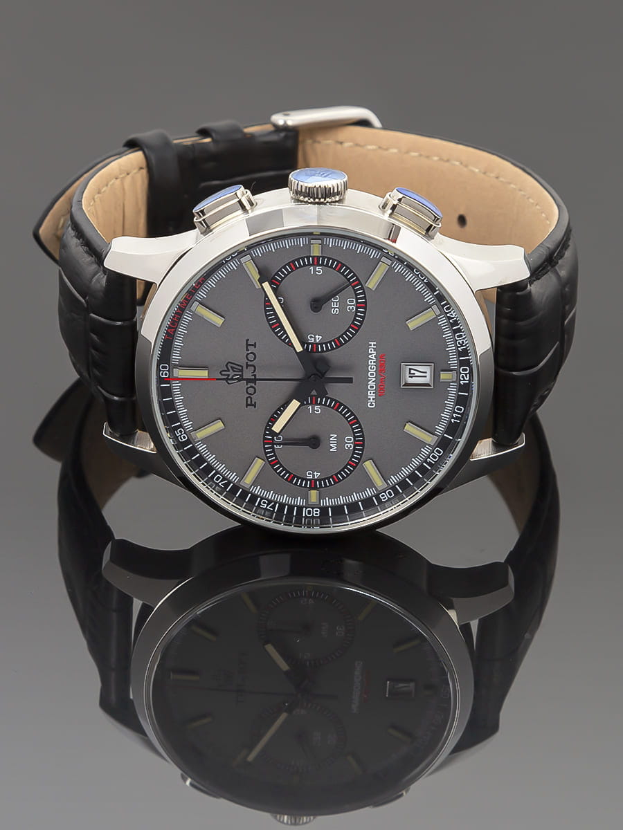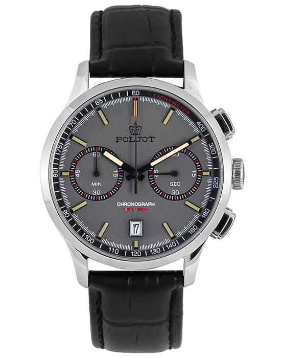 Poljot 6S21.901213 — современные мужские часы с выразительным спортивным дизайном и надёжной функциональностью. Корпус из нержавеющей стали подчёркивает прочность и уверенный характер модели, а глубокий циферблат с счётчиками хронографаХронографФункция позволяет измерять отрезки времени с особой точностью: часы, минуты, секунды. Верным признаком хронографа является наличие на циферблате 3 дополнительных окошек-счётчиков. и аккуратным окном даты на позиции «6 часов» придаёт часам динамичный вид. Контрастные стрелки и метки с люминесцентным покрытиемЛюминесцентное покрытиеПозволяет считывать показания времени в темноте. Производители наносят на стрелки, часовые индексы, безель или поверхность циферблата светонакопительный состав, дающий холодное свечение. обеспечивают удобство считывания информации в любое время суток, а внешняя шкала тахиметраТахиметрРазмеченная шкала, располагается на ободке или безеле часов. Тахиметр позволяет рассчитать скорость на определённом участке пути, расстояние измеряется в километрах или милях. добавляет спортивную функциональность. Прочное минеральное стеклоМинеральное стеклоМинеральное стекло представляет собой искусственно выращенный минерал кварца. Такое стекло отличается особой устойчивостью к повреждениям и царапинам. Уступает по некоторым качествам сапфировому стеклу. защищает циферблат от царапин, а ремешок из натуральной кожи гарантирует комфорт и элегантную посадку на запястье. Poljot — это гармония классики и спортивного духа, созданная для мужчин, ценящих точность, надёжность и уверенный стиль.