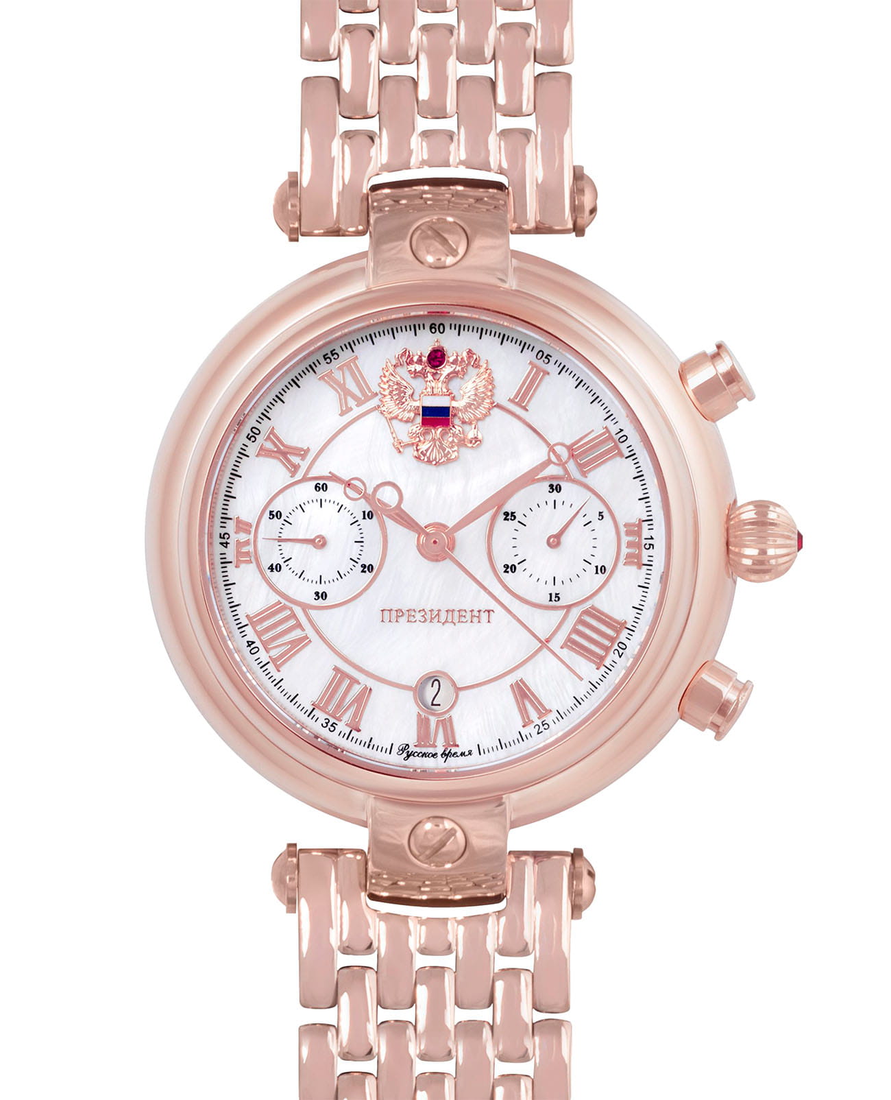 Мужские часы из коллекции «Президент» — это сочетание элегантности, точности и российского качества. Модель выполнена в круглой форме с корпусом диаметром 42,5 мм и защищённым сапфировым стекломСапфировое стеклоПрочный и надёжный материал из кристалла сапфира синтетического происхождения, характеризующийся особой твёрдостью и устойчивостью к царапинам и повреждениям., устойчивым к царапинам и механическим повреждениям. Циферблат выполнен из перламутра, а элементы корпуса украшены кристаллами Swarovski, что придаёт модели особую роскошь и изысканность. Часы оснащены механизмом хронографа с автоподзаводом, обеспечивающим надёжную работу и минимальное обслуживание. Задняя крышка с чеканкой Герба России подчёркивает национальный стиль и уникальность модели. В комплект поставки входят подарочный футляр, паспорт с гарантийным талоном и фирменный пакет, что делает их идеальным выбором для подарка или повседневного использования. Водонепроницаемость позволяет использовать часы в повседневных условиях — при мытье рук или под лёгким дождём. Браслет изготовлен из нержавеющей стали, что обеспечивает прочность и комфорт при ношении. Эти часы станут универсальным аксессуаром для тех, кто ценит сочетание стиля, функциональности и российского мастерства — идеальный выбор для уверенных в себе мужчин, следящих за своим имиджем и предпочитающих выделяться.