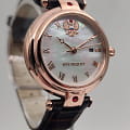 Часы «Президент» модели 5039113 — это женские механические наручные часы с автоподзаводом, сочетающие элегантный дизайн и надёжность. Механизм: японский механизм Miyota 6T15 с автоподзаводом, обеспечивающий точность и долговечность. Функции: часы, минуты, секунды, дата. Корпус: из нержавеющей стали с покрытием розового золотаPVDУльтратонкое покрытие наносится в технике вакуумного напыления, сочетает в себе нитрид титана особой прочности со слоем золота или оксида хрома. Несёт в себе декоративную или защитную функцию., диаметром 30 мм и толщиной 10 мм. Циферблат: перламутровый с римскими цифрами и кристаллами , подчёркивающий утончённость модели. Стекло: минеральноеМинеральное стеклоМинеральное стекло представляет собой искусственно выращенный минерал кварца. Такое стекло отличается особой устойчивостью к повреждениям и царапинам. Уступает по некоторым качествам сапфировому стеклу., устойчивое к царапинам. Водонепроницаемость: 3 ATM (30 метров), защищает от случайных брызг и дождя. Ремешок: кожаный, шириной 14 мм, обеспечивающий комфорт при ношении. Эти часы идеально подойдут для женщин, ценящих сочетание классического стиля и современных технологий.