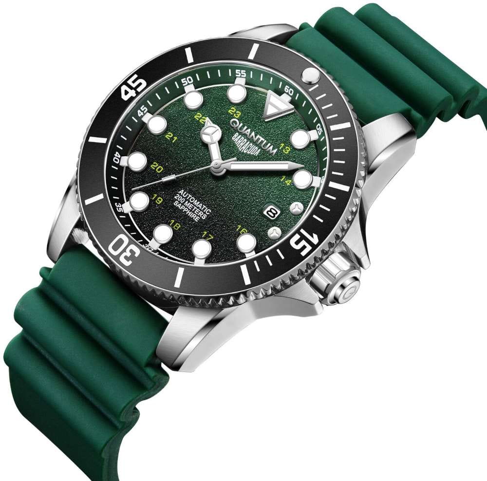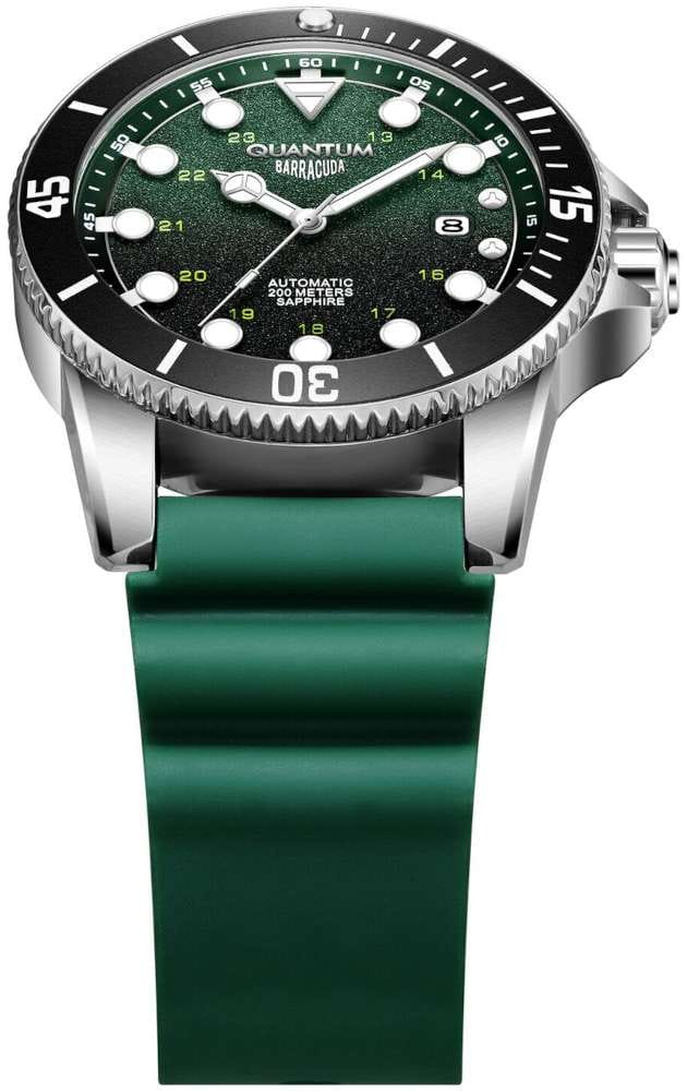 Мужские механические часы с автоподзаводом Quantum BAR1115.375 — надёжный спортивный аксессуар с ярким дизайном и усиленной водозащитой. Корпус круглый, из нержавеющей стали, диаметром 44 мм. Циферблат — зелёный с окошком даты. Стекло — сапфировоеСапфировое стеклоПрочный и надёжный материал из кристалла сапфира синтетического происхождения, характеризующийся особой твёрдостью и устойчивостью к царапинам и повреждениям.. Механизм — японский автоматический Citizen с функцией автоподзавода. Водонепроницаемость 200 м. Ремешок — зелёный силиконовый «гармошка» на стандартной застёжке. Идеальный выбор для тех, кто ценит турецкий дизайн и высокую функциональность.