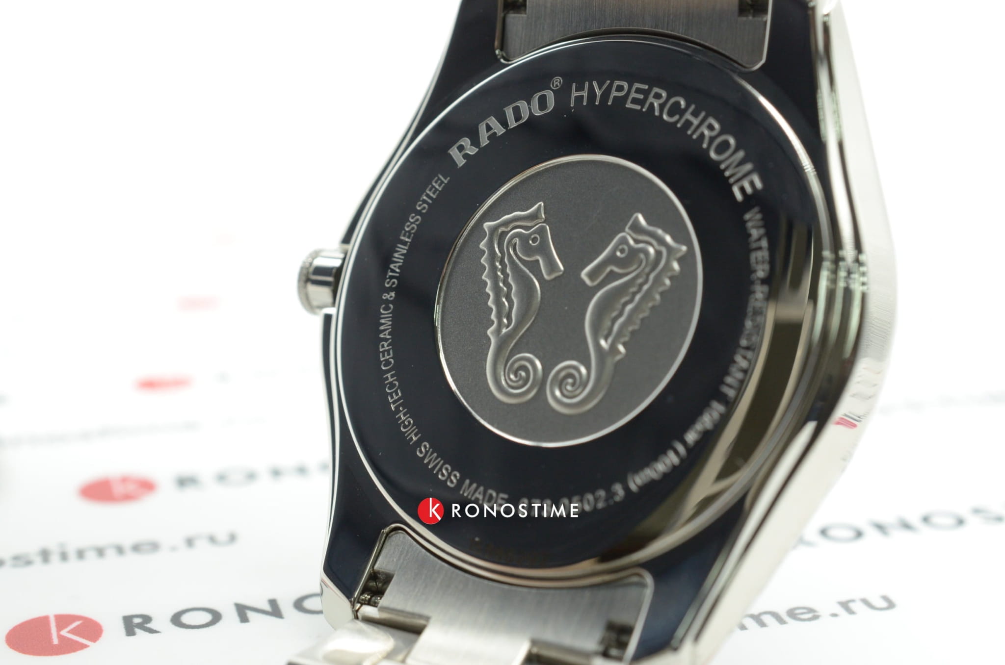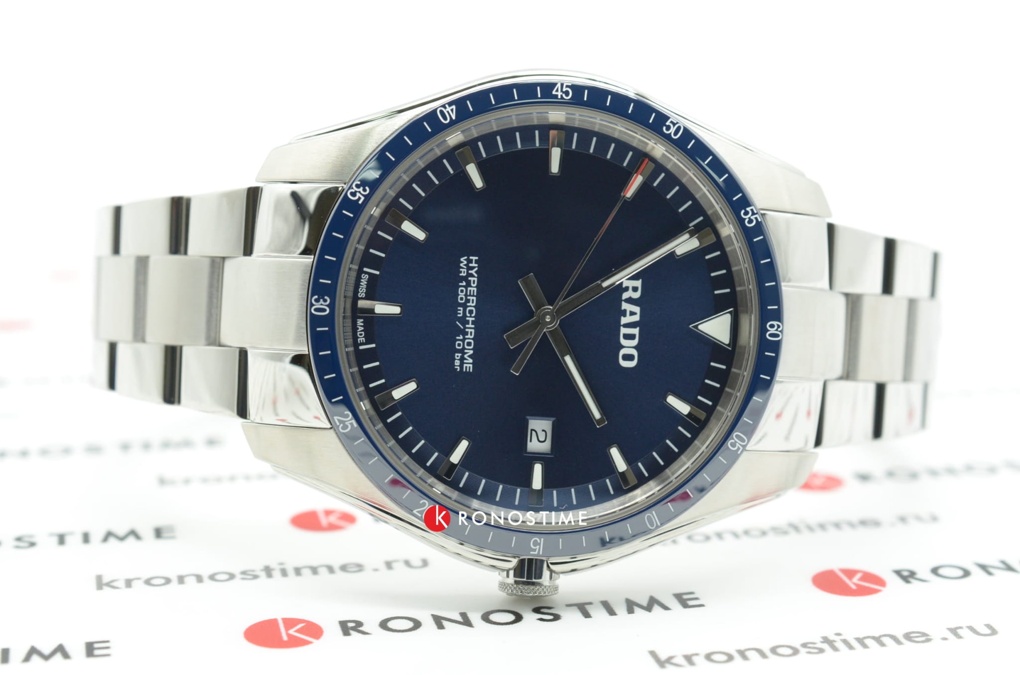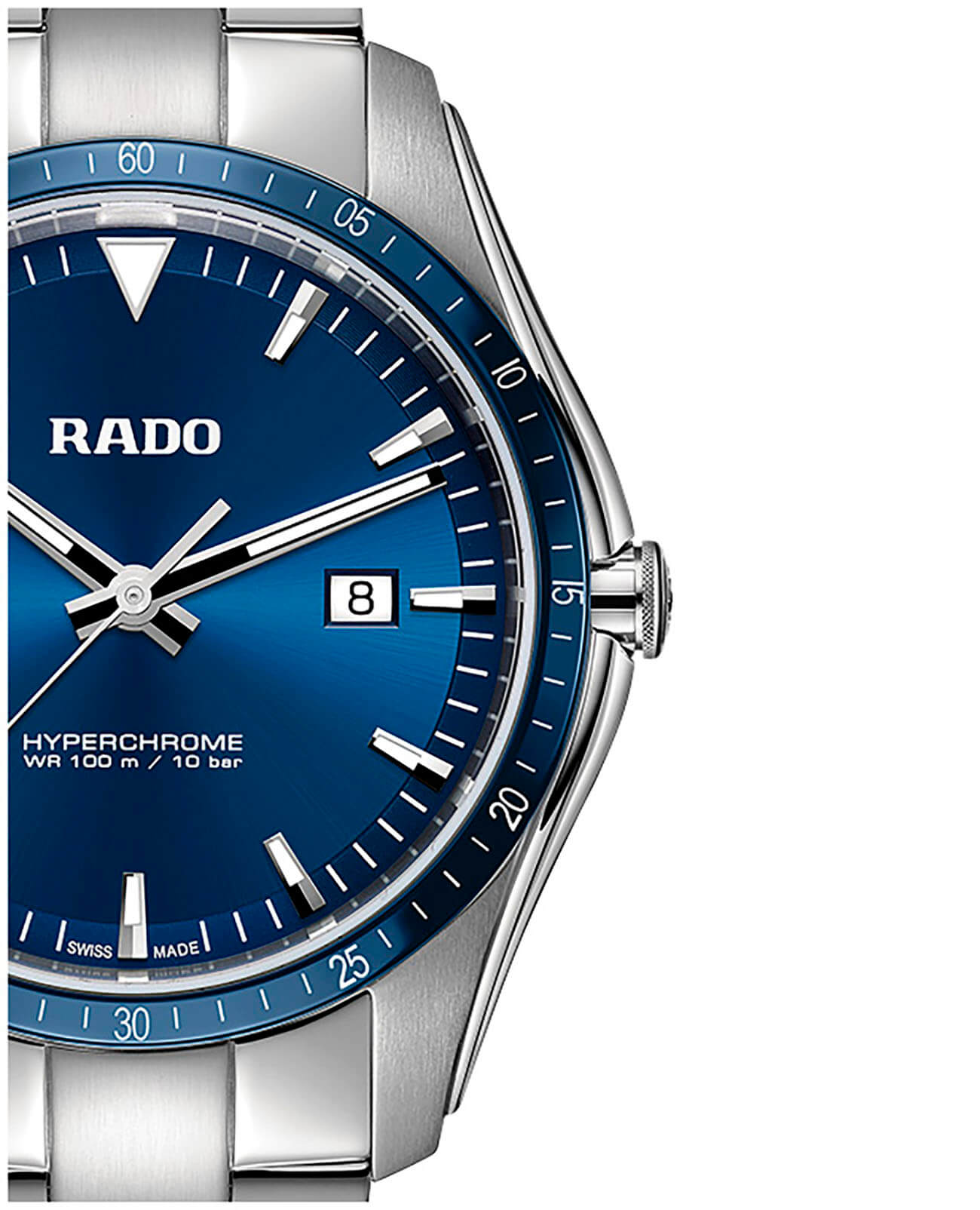 Швейцарские кварцевые часы Rado Hyperchrome R32502203. Сапфировое стеклоСапфировое стеклоПрочный и надёжный материал из кристалла сапфира синтетического происхождения, характеризующийся особой твёрдостью и устойчивостью к царапинам и повреждениям. устойчивое к мелким механическим повреждениям. Корпус изготовлен из нержавеющей стали. БезельБезельВнешний ободок, закрепляющий стекло. В спортивных часах так называется поворотное кольцо с делениями на циферблате, выполняет роль таймера – замеряет отрезки времени на шкале. Неподвижный безель – элемент декора. Однонаправленно вращающийся безель на дайверских часах позволяет фиксировать моменты погружения и выныривания на поверхность. из высокотехнологичной керамикиВысокотехнологичная керамикаИнновационный запатентованный Rado материал с гладкой или матовой поверхностью. Керамика за счёт кристаллической структуры обладает повышенной устойчивостью от возникновения царапин. Материал способен принимать температуру тела человека, обеспечивая невероятный комфорт при ношении.. Стрелки с люминесцентным покрытиемЛюминесцентное покрытиеПозволяет считывать показания времени в темноте. Производители наносят на стрелки, часовые индексы, безель или поверхность циферблата светонакопительный состав, дающий холодное свечение.. Класс водозащиты: 100 метров, позволит плавать, нырять и заниматься другими водными видами спорта. Браслет из стали на раскладной застёжкеРаскладная застёжкаТакой тип застёжки используется только на браслетах из металла. Она никогда не раскрывается полностью, происходит разделение на 2 и более частей. Раскладывающая застёжка снизит вероятность потери часов к минимуму..