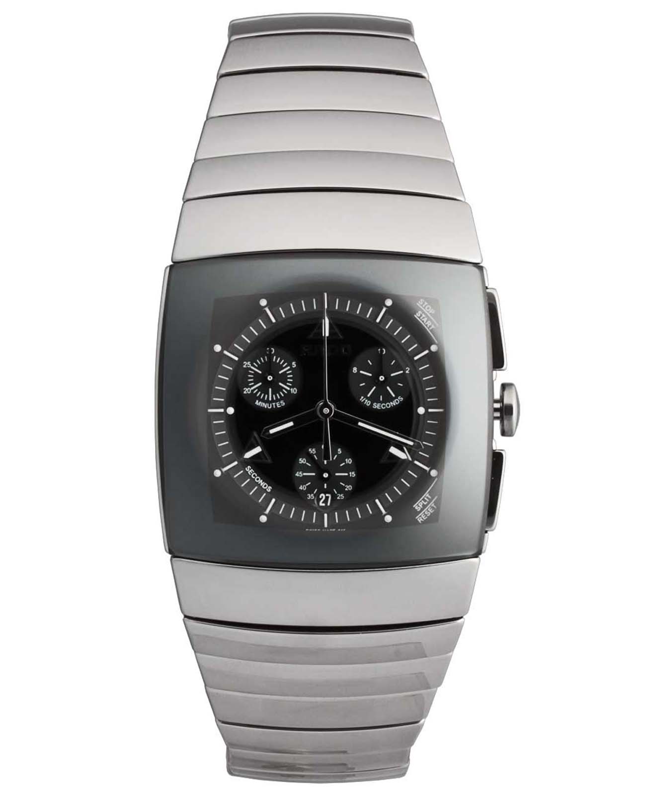 Мужские швейцарские часы-хронографХронографФункция позволяет измерять отрезки времени с особой точностью: часы, минуты, секунды. Верным признаком хронографа является наличие на циферблате 3 дополнительных окошек-счётчиков. Rado Sintra R13870152, кварцевый механизм с высокой точностью. Сапфировое стеклоСапфировое стеклоПрочный и надёжный материал из кристалла сапфира синтетического происхождения, характеризующийся особой твёрдостью и устойчивостью к царапинам и повреждениям. устойчивое к появлению царапин, обладающее высокой прозрачностью. Корпус из высокотехнологичной керамикиВысокотехнологичная керамикаИнновационный запатентованный Rado материал с гладкой или матовой поверхностью. Керамика за счёт кристаллической структуры обладает повышенной устойчивостью от возникновения царапин. Материал способен принимать температуру тела человека, обеспечивая невероятный комфорт при ношении.. Стрелки и метки с люминесцентным покрытиемЛюминесцентное покрытиеПозволяет считывать показания времени в темноте. Производители наносят на стрелки, часовые индексы, безель или поверхность циферблата светонакопительный состав, дающий холодное свечение.. Отображение даты в положении 6 часов. Класс водозащиты: 30 метров, позволит защитить корпус от случайных брызг или капель дождя. Браслет из высокотехнологичной керамикиВысокотехнологичная керамикаИнновационный запатентованный Rado материал с гладкой или матовой поверхностью. Керамика за счёт кристаллической структуры обладает повышенной устойчивостью от возникновения царапин. Материал способен принимать температуру тела человека, обеспечивая невероятный комфорт при ношении. на раскладной застёжкеРаскладная застёжкаТакой тип застёжки используется только на браслетах из металла. Она никогда не раскрывается полностью, происходит разделение на 2 и более частей. Раскладывающая застёжка снизит вероятность потери часов к минимуму..