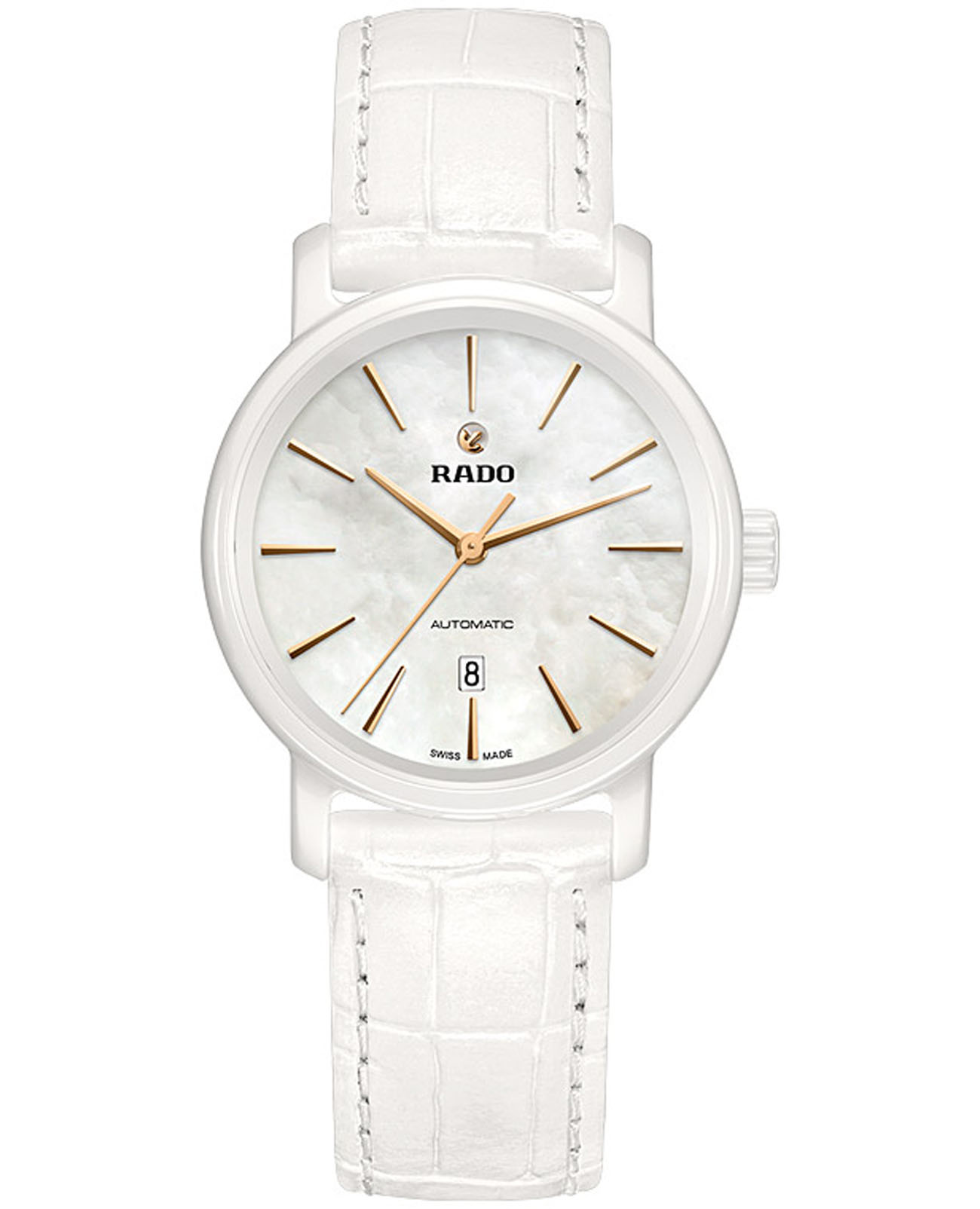 Женские швейцарские механические часы с автоподзаводом Rado Diamaster R14044925. Сапфировое стеклоСапфировое стеклоПрочный и надёжный материал из кристалла сапфира синтетического происхождения, характеризующийся особой твёрдостью и устойчивостью к царапинам и повреждениям. устойчивое к мелким механическим повреждениям. Корпус часов изготовлен из высокотехнологичной керамикиВысокотехнологичная керамикаИнновационный запатентованный Rado материал с гладкой или матовой поверхностью. Керамика за счёт кристаллической структуры обладает повышенной устойчивостью от возникновения царапин. Материал способен принимать температуру тела человека, обеспечивая невероятный комфорт при ношении.. Окошко даты находится в положении 6 часов. Класс водозащиты: 50 метров, позволит защитить корпус от случайных брызг или капель дождя. Кожаный ремешок с раскладной застёжкойРаскладная застёжкаТакой тип застёжки используется только на браслетах из металла. Она никогда не раскрывается полностью, происходит разделение на 2 и более частей. Раскладывающая застёжка снизит вероятность потери часов к минимуму..