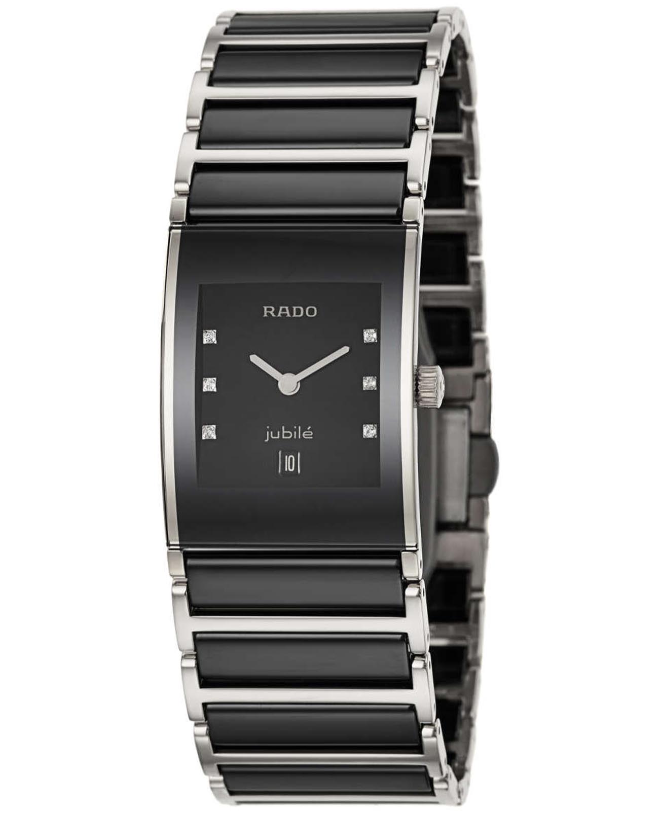 Женские часы Rado Integral R20785752 с надёжным кварцевым механизмом. Сапфировое стеклоСапфировое стеклоПрочный и надёжный материал из кристалла сапфира синтетического происхождения, характеризующийся особой твёрдостью и устойчивостью к царапинам и повреждениям. устойчивое к мелким механическим повреждениям. Корпус выполнен из нержавеющей стали. Класс водозащиты: 30 метров, позволит защитить корпус от случайных брызг или капель дождя. Циферблат декорирован 6 бриллиантами. Стальной браслет с вставками из высокотехнологичной керамикиВысокотехнологичная керамикаИнновационный запатентованный Rado материал с гладкой или матовой поверхностью. Керамика за счёт кристаллической структуры обладает повышенной устойчивостью от возникновения царапин. Материал способен принимать температуру тела человека, обеспечивая невероятный комфорт при ношении. на раскладной застёжкеРаскладная застёжкаТакой тип застёжки используется только на браслетах из металла. Она никогда не раскрывается полностью, происходит разделение на 2 и более частей. Раскладывающая застёжка снизит вероятность потери часов к минимуму.. Отображение даты в положении «6 часов».