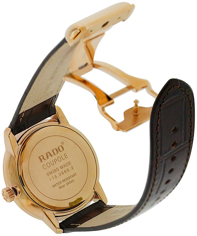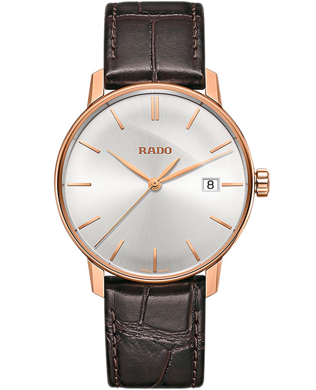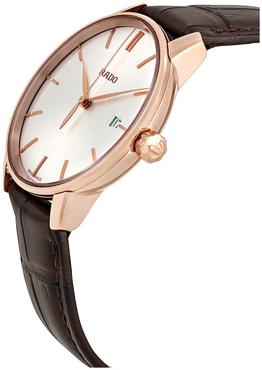 Мужские швейцарские часы с Rado Coupole R22866105, кварцевый механизм с высокой точностью. Корпус часов изготовлен из нержавеющей стали с PVD-покрытиемPVDУльтратонкое покрытие наносится в технике вакуумного напыления, сочетает в себе нитрид титана особой прочности со слоем золота или оксида хрома. Несёт в себе декоративную или защитную функцию.. Сапфировое стеклоСапфировое стеклоПрочный и надёжный материал из кристалла сапфира синтетического происхождения, характеризующийся особой твёрдостью и устойчивостью к царапинам и повреждениям. устойчивое к мелким механическим повреждениям. Окошко даты находится в положении 3 часа. Класс водозащиты: 50 метров, позволит защитить корпус от случайных брызг или капель дождя. Кожаный ремешок на раскладной застёжкеРаскладная застёжкаТакой тип застёжки используется только на браслетах из металла. Она никогда не раскрывается полностью, происходит разделение на 2 и более частей. Раскладывающая застёжка снизит вероятность потери часов к минимуму..