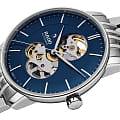 Лаконичный синий циферблат создает невероятный контраст с холодным блеском нержавеющей стали 316L, Часы скелетоны привлекают необычным браслетом, состоящим из звеньев разного размера. Модель оснащена автоматическим калибром ETA C07.631 с увеличенным запасом хода до 80 часов, за его работой можно понаблюдать сквозь прозрачную заднюю крышку и 3 окошка в циферблате. Сапфировое стекло с антибликовой обработкой устойчиво к возникновению царапин. Водостойкость 5 бар. . Диаметр корпуса: 41 мм.