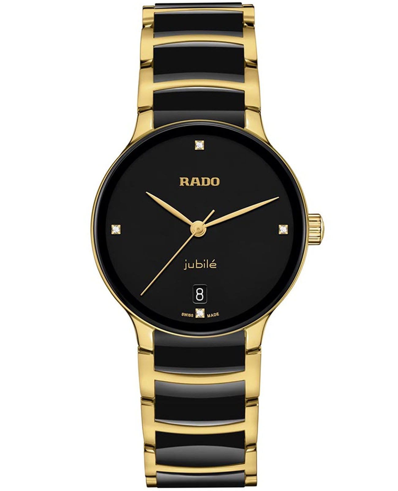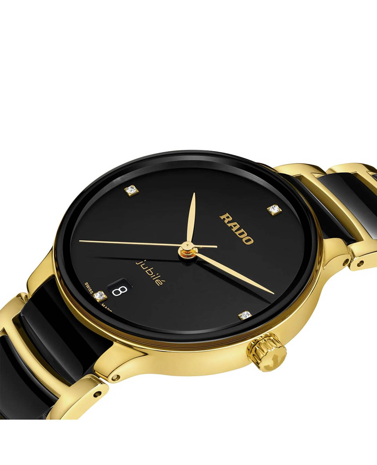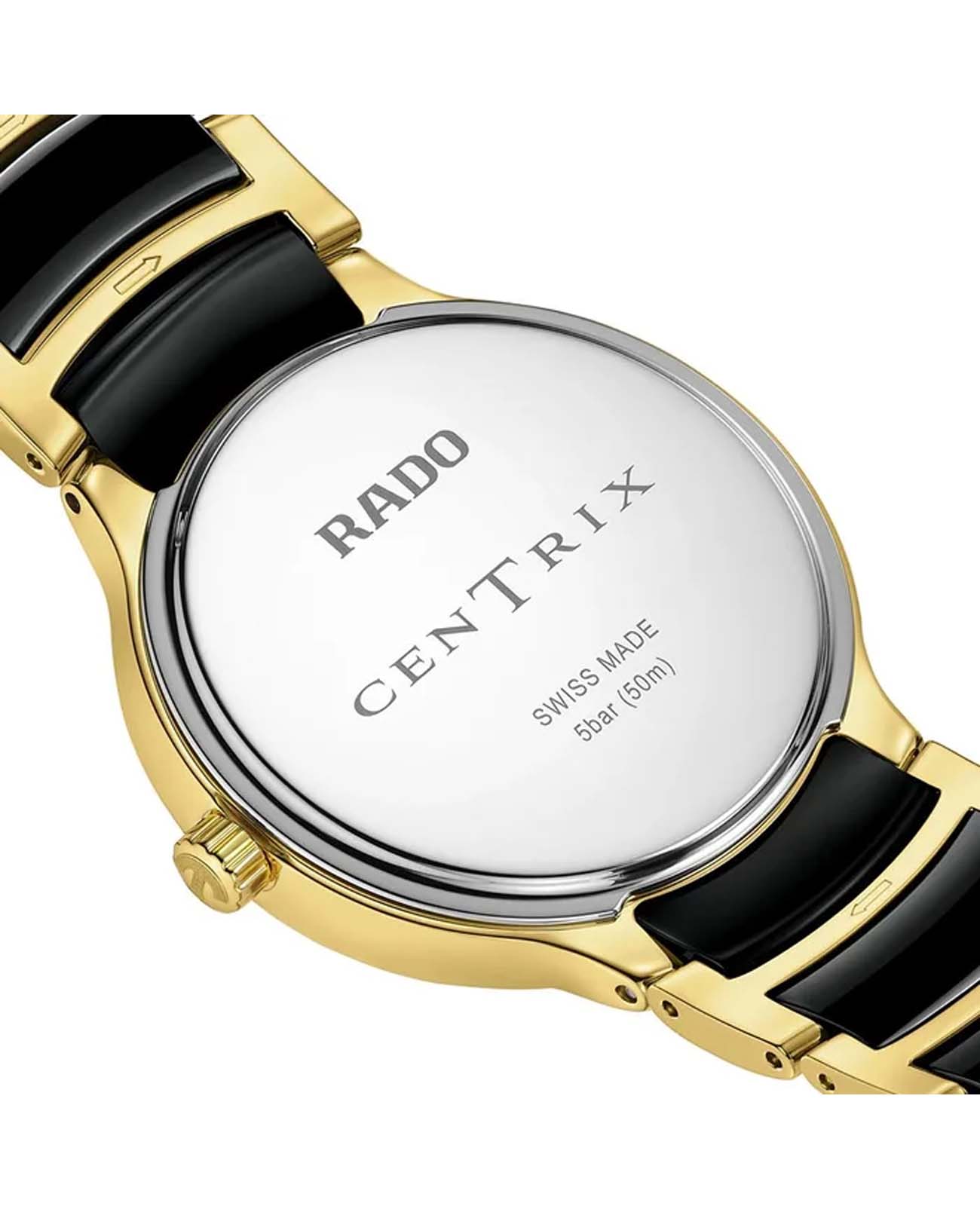 Швейцарские женские механические часы с автоподзаводом Rado Centrix R30039712. Сапфировое стеклоСапфировое стеклоПрочный и надёжный материал из кристалла сапфира синтетического происхождения, характеризующийся особой твёрдостью и устойчивостью к царапинам и повреждениям. устойчивое к мелким механическим повреждениям. Корпус часов изготовлен из нержавеющей стали с PVD-покрытиемPVDУльтратонкое покрытие наносится в технике вакуумного напыления, сочетает в себе нитрид титана особой прочности со слоем золота или оксида хрома. Несёт в себе декоративную или защитную функцию.. БезельБезельВнешний ободок, закрепляющий стекло. В спортивных часах так называется поворотное кольцо с делениями на циферблате, выполняет роль таймера – замеряет отрезки времени на шкале. Неподвижный безель – элемент декора. Однонаправленно вращающийся безель на дайверских часах позволяет фиксировать моменты погружения и выныривания на поверхность. из керамики. Окошко даты находится в положении 6 часов. Циферблат украшен бриллиантами. Класс водозащиты: 30 метров, позволит защитить корпус от случайных брызг или капель дождя. Браслет нержавеющей стали с PVD-покрытиемPVDУльтратонкое покрытие наносится в технике вакуумного напыления, сочетает в себе нитрид титана особой прочности со слоем золота или оксида хрома. Несёт в себе декоративную или защитную функцию. и высокотехнологичной плазменной керамикиВысокотехнологичная плазменная керамикаИнновационный материал, технология запатентована. Выплавление керамики осуществляется в печи при 20 000 °C, белоснежный материал под воздействием ультравысокой температуры приобретает уникальный блеск, присущий металлам. на раскладной застёжкеРаскладная застёжкаТакой тип застёжки используется только на браслетах из металла. Она никогда не раскрывается полностью, происходит разделение на 2 и более частей. Раскладывающая застёжка снизит вероятность потери часов к минимуму..