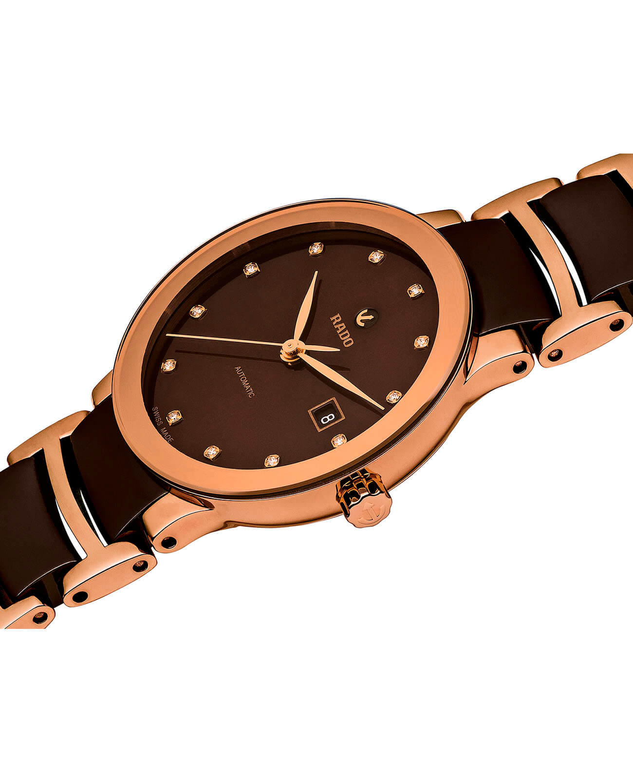 Изысканная модель в минималистичном исполнении грамотно завершит образ. Благодаря роскошному циферблату премиальный аксессуар сразу притягивает внимание, перед блеском 12 бриллиантов в 0,025 карат. Автоподзавод. Швейцарский калибр ETA 2671 имеет запас хода до 38 часов. Скелетонизированная задняя крышка стального корпуса. Сапфировое стекло. Браслет из нержавеющей стали 316L с PVD-покрытиемPVDУльтратонкое покрытие наносится в технике вакуумного напыления, сочетает в себе нитрид титана особой прочности со слоем золота или оксида хрома. Несёт в себе декоративную или защитную функцию. и вставок из высокотехнологичной керамикиВысокотехнологичная керамикаИнновационный запатентованный Rado материал с гладкой или матовой поверхностью. Керамика за счёт кристаллической структуры обладает повышенной устойчивостью от возникновения царапин. Материал способен принимать температуру тела человека, обеспечивая невероятный комфорт при ношении.. Водонепроницаемость 30 метров. Надёжная . Отображение числа. Диаметр корпуса: 28 мм.
