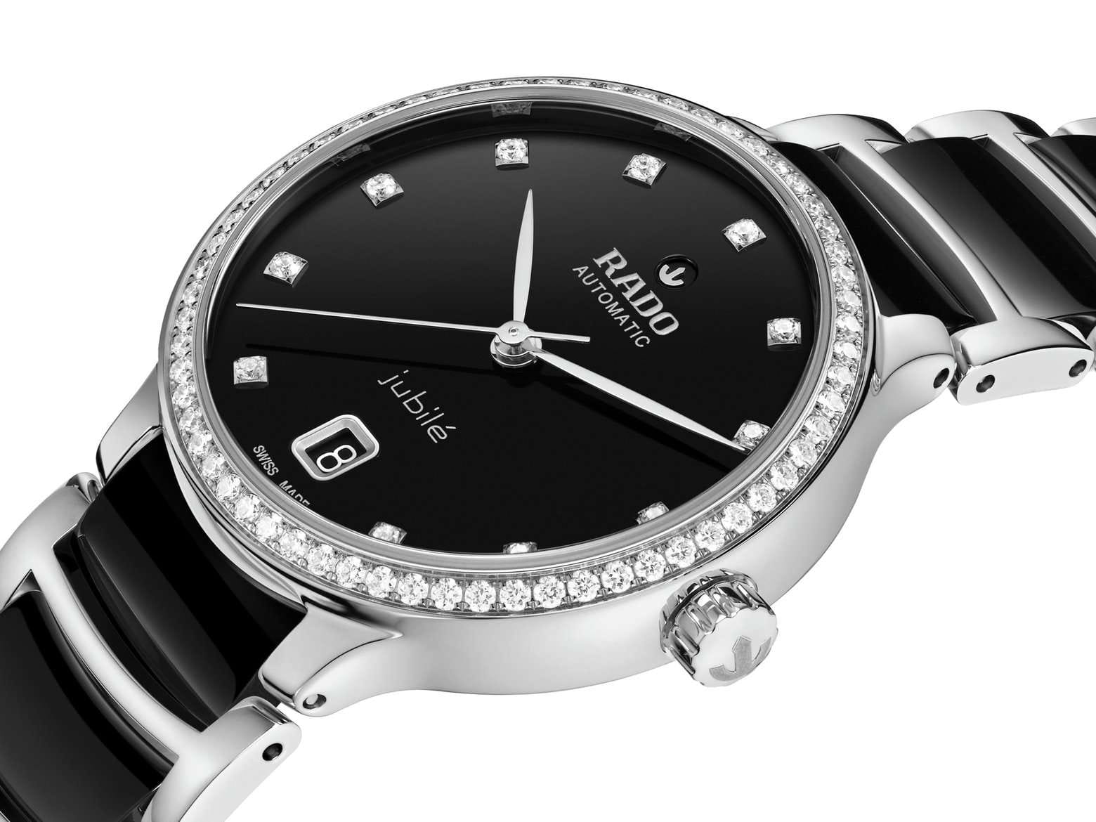 Женские механические часы с автоподзаводом Rado из коллекции Centrix — это гармоничное сочетание искусства, дизайна и швейцарского мастерства. Корпус диаметром 35 мм и толщиной 11,1 мм выполнен из нержавеющей стали 316L. БезельБезельВнешний ободок, закрепляющий стекло. В спортивных часах так называется поворотное кольцо с делениями на циферблате, выполняет роль таймера – замеряет отрезки времени на шкале. Неподвижный безель – элемент декора. Однонаправленно вращающийся безель на дайверских часах позволяет фиксировать моменты погружения и выныривания на поверхность. из нержавеющей стали инкрустирован 60 бриллиантами полной огранки Top Wesselton VS-SI. Циферблат чёрного цвета с лакированным покрытием украшен 11 бриллиантами и дополнен окошком даты в положении 6 часов. Циферблат защищён выпуклым сапфировым стекломСапфировое стеклоПрочный и надёжный материал из кристалла сапфира синтетического происхождения, характеризующийся особой твёрдостью и устойчивостью к царапинам и повреждениям. с антибликовым покрытиемАнтибликовое покрытиеСлой оксида металла в 0,13-0,3 микрон, благодаря которому стекло часов не бликует и не отражает свет. Антибликовое покрытие уменьшает отражение света в 10 раз, обеспечивая отличную читаемость показателей циферблата. с обеих сторон. Механизм — автоматический калибр R763 с антимагнитной пружиной Nivachron™Nivachron™Специально разработанный инновационный сплав Nivachron™ повышает устойчивость часов к воздействию магнитных полей., отрегулированный в пяти положениях, с запасом хода 80 часов. Прозрачная задняя крышка с сапфировым стеклом позволяет наблюдать за работой механизма. Часы оснащены браслетом из полированной нержавеющей стали и вставками из высокотехнологичной керамикиВысокотехнологичная керамикаИнновационный запатентованный Rado материал с гладкой или матовой поверхностью. Керамика за счёт кристаллической структуры обладает повышенной устойчивостью от возникновения царапин. Материал способен принимать температуру тела человека, обеспечивая невероятный комфорт при ношении. чёрного цвета, а также трёхсекционной застёжкой из нержавеющей стали. Водонепроницаемость 50 м позволяет использовать часы в повседневных условиях. Гарантия — 5 лет. Идеальный выбор для тех, кто ценит роскошь, точность и элегантность.