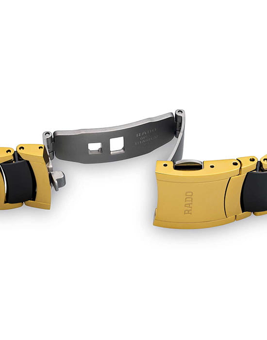 Аксессуар в золотом цвете станет достойным дополнением к образу солидного и делового мужчины. Это стильная деталь современного имиджа, особый шик ей придают 12 бриллиантов цвета Top Wesselton в 0,034 карат. Наручные часы с автоподзаводом работают за счёт калибра ETA C07.611, который отличается увеличенным запасом хода до 80 часов. Понаблюдать за движением частиц механизма можно через прозрачную заднюю крышку. Надёжный корпус из хирургической стали 316L. Браслет имеет вставки из высокотехнологичной керамикиВысокотехнологичная керамикаИнновационный запатентованный Rado материал с гладкой или матовой поверхностью. Керамика за счёт кристаллической структуры обладает повышенной устойчивостью от возникновения царапин. Материал способен принимать температуру тела человека, обеспечивая невероятный комфорт при ношении.. Износоустойчивое PVD-покрытиеPVDУльтратонкое покрытие наносится в технике вакуумного напыления, сочетает в себе нитрид титана особой прочности со слоем золота или оксида хрома. Несёт в себе декоративную или защитную функцию. цвета розового золота. Стекло из сапфира. Апертура даты. Диаметр корпуса: 38 мм.