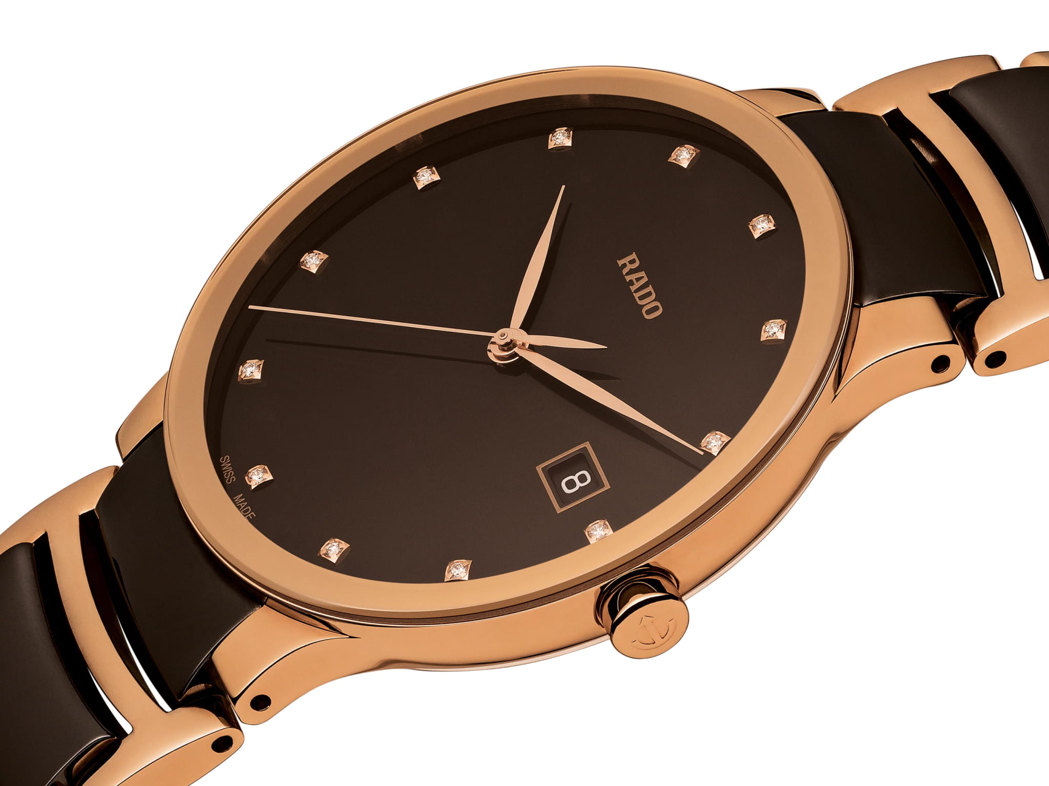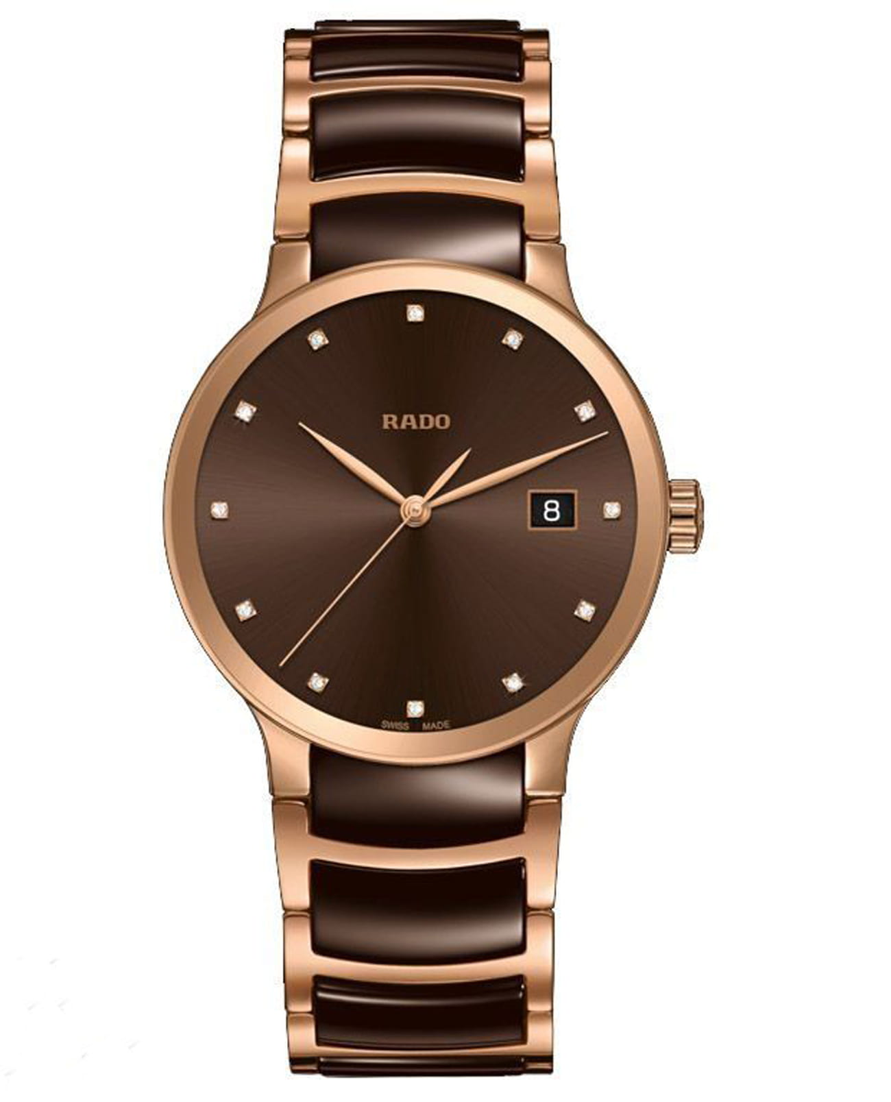 Женские швейцарские механические часы из коллекции Centrix являют собой современный элемент роскошного стиля. Аксессуар в коричневом цвете станет достойным дополнением к образу. Это стильная деталь современного имиджа, особый шик ей придают 12 бриллиантов цвета Top Wesselton в 0,034 карат. Наручные часы с автоподзаводом работают за счёт калибра ETA C07.611, который отличается увеличенным запасом хода до 80 часов. Надёжный корпус из хирургической стали 316L. Браслет имеет вставки из высокотехнологичной керамикиВысокотехнологичная керамикаИнновационный запатентованный Rado материал с гладкой или матовой поверхностью. Керамика за счёт кристаллической структуры обладает повышенной устойчивостью от возникновения царапин. Материал способен принимать температуру тела человека, обеспечивая невероятный комфорт при ношении.. Износоустойчивое PVD-покрытиеPVDУльтратонкое покрытие наносится в технике вакуумного напыления, сочетает в себе нитрид титана особой прочности со слоем золота или оксида хрома. Несёт в себе декоративную или защитную функцию.. Стекло из сапфира. Апертура даты. Диаметр корпуса: 28 мм. Производство и сборка: Швейцария.