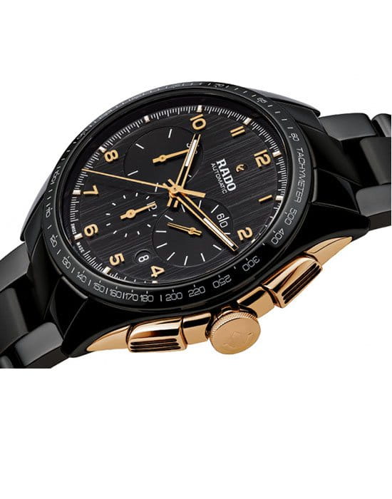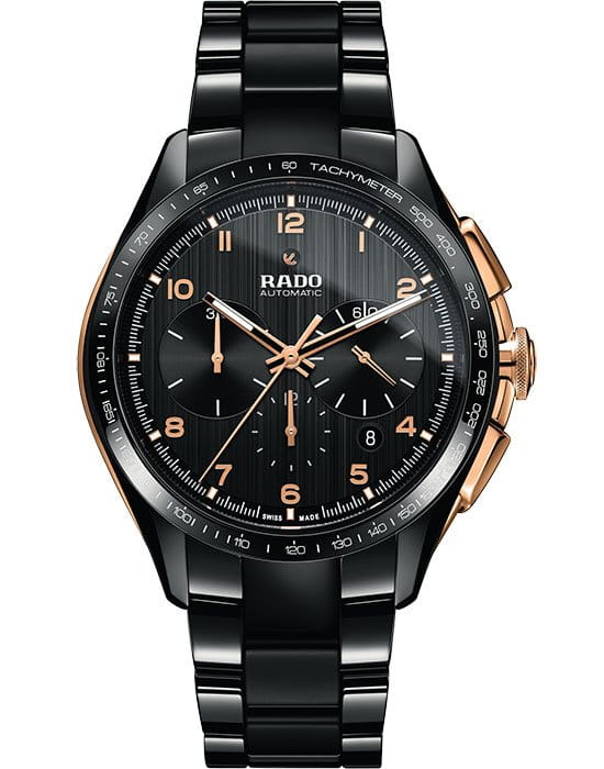 Представительские часы, способные по-настоящему преобразить индивидуальный образ, сделаны из высококачественных революционных материалов. Для корпуса использовали долговечную хирургическую сталь 316L с частичным PVD-покрытиемPVDУльтратонкое покрытие наносится в технике вакуумного напыления, сочетает в себе нитрид титана особой прочности со слоем золота или оксида хрома. Несёт в себе декоративную или защитную функцию. и высокотехнологичную керамикуВысокотехнологичная керамикаИнновационный запатентованный Rado материал с гладкой или матовой поверхностью. Керамика за счёт кристаллической структуры обладает повышенной устойчивостью от возникновения царапин. Материал способен принимать температуру тела человека, обеспечивая невероятный комфорт при ношении., браслет также сделан керамическим. Автоматический хронографХронографФункция позволяет измерять отрезки времени с особой точностью: часы, минуты, секунды. Верным признаком хронографа является наличие на циферблате 3 дополнительных окошек-счётчиков. оснащён механизмом ETA 2894-2 с запасом хода 45 часов. Прозрачная задняя крышка. Стекло из сапфира с антибликовой поверхностью. Водозащита 100 метров. Секундомер, тахиметрТахиметрРазмеченная шкала, располагается на ободке или безеле часов. Тахиметр позволяет рассчитать скорость на определённом участке пути, расстояние измеряется в километрах или милях., апертура даты. Диаметр корпуса: 45 мм.