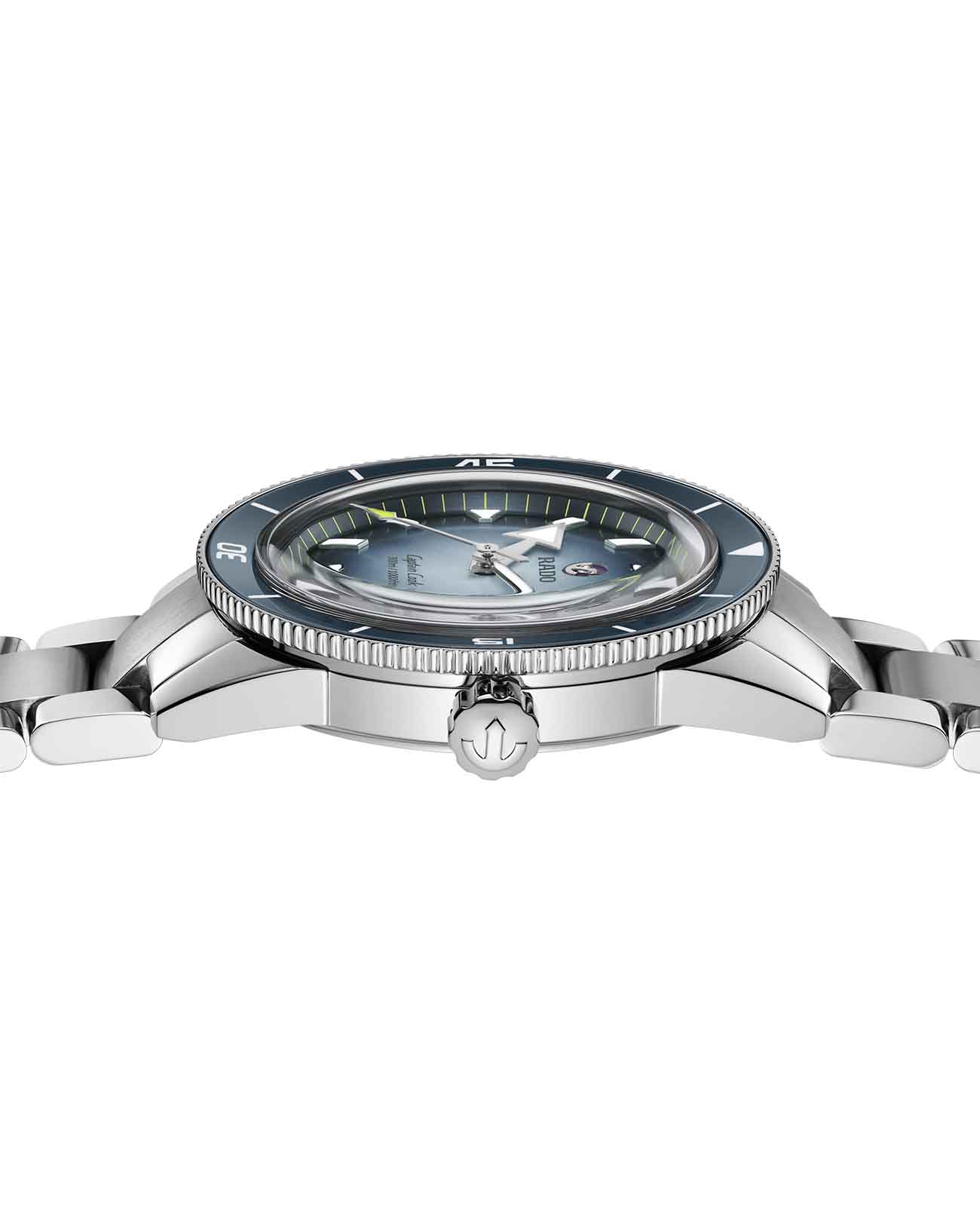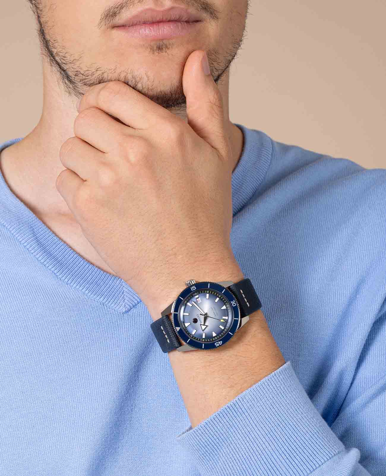 Вращающийся безельБезельВнешний ободок, закрепляющий стекло. В спортивных часах так называется поворотное кольцо с делениями на циферблате, выполняет роль таймера – замеряет отрезки времени на шкале. Неподвижный безель – элемент декора. Однонаправленно вращающийся безель на дайверских часах позволяет фиксировать моменты погружения и выныривания на поверхность. из стали с PVD-покрытиемPVDУльтратонкое покрытие наносится в технике вакуумного напыления, сочетает в себе нитрид титана особой прочности со слоем золота или оксида хрома. Несёт в себе декоративную или защитную функцию. помогает отслеживать время подводного погружения или другие временные интервалы. Все стрелки и метки на циферблате покрыты люминесцентным составомЛюминесцентное покрытиеПозволяет считывать показания времени в темноте. Производители наносят на стрелки, часовые индексы, безель или поверхность циферблата светонакопительный состав, дающий холодное свечение., что обеспечивает хорошую видимость в темное время суток.