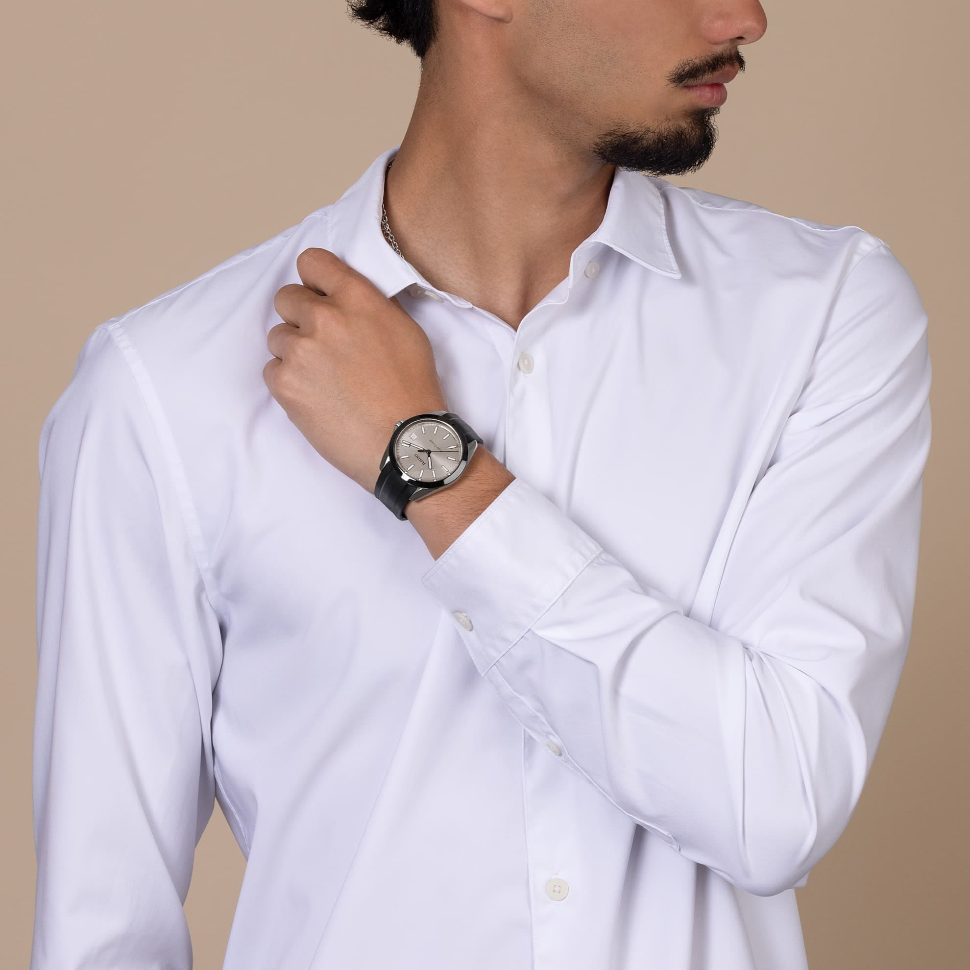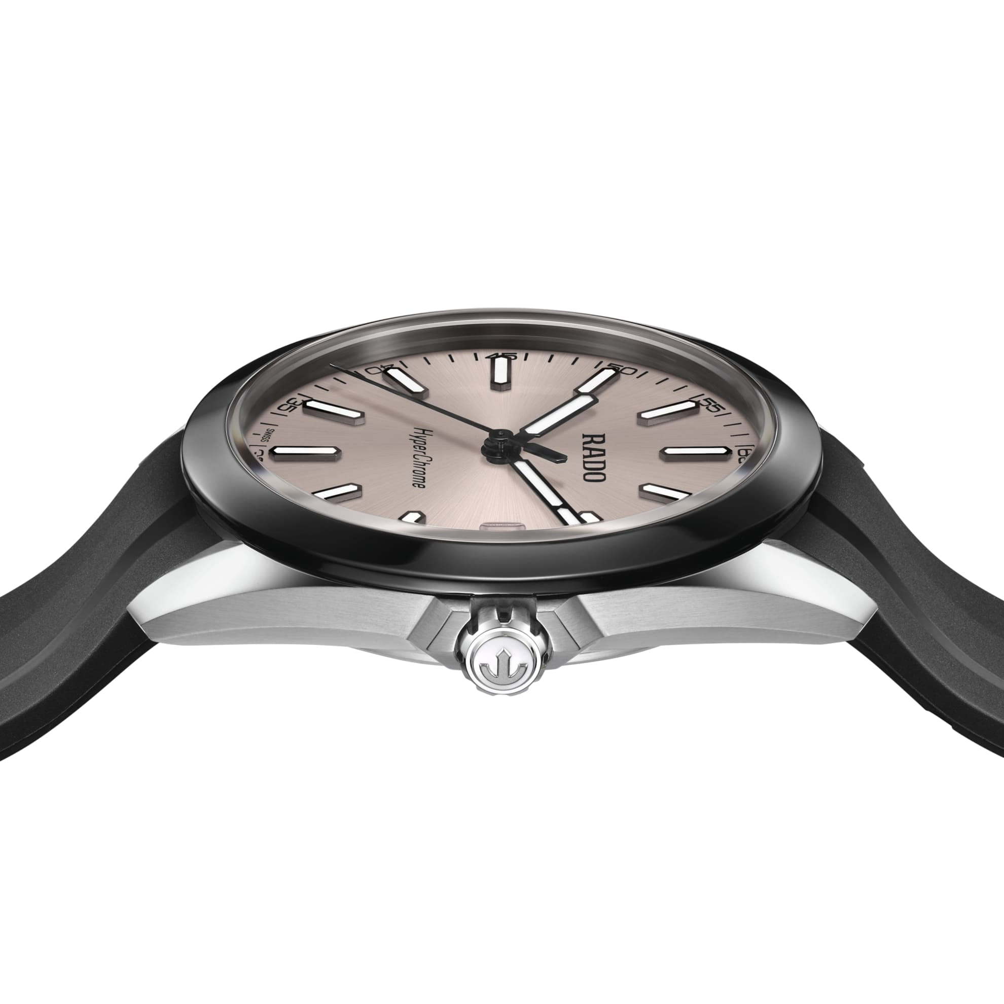 Мужские кварцевые часы Rado HyperChrome — это современное воплощение точности и мастерства материалов. Корпус диаметром 41,5 мм и толщиной 11,7 мм выполнен из полированной и матовой нержавеющей стали. БезельБезельВнешний ободок, закрепляющий стекло. В спортивных часах так называется поворотное кольцо с делениями на циферблате, выполняет роль таймера – замеряет отрезки времени на шкале. Неподвижный безель – элемент декора. Однонаправленно вращающийся безель на дайверских часах позволяет фиксировать моменты погружения и выныривания на поверхность. изготовлен из высокотехнологичной керамикиВысокотехнологичная керамикаИнновационный запатентованный Rado материал с гладкой или матовой поверхностью. Керамика за счёт кристаллической структуры обладает повышенной устойчивостью от возникновения царапин. Материал способен принимать температуру тела человека, обеспечивая невероятный комфорт при ношении. чёрного цвета, придающей часам прочность и изысканность. Циферблат бежевого цвета с лакированным покрытием оформлен индексами и стрелками с люминесцентным покрытиемЛюминесцентное покрытиеПозволяет считывать показания времени в темноте. Производители наносят на стрелки, часовые индексы, безель или поверхность циферблата светонакопительный состав, дающий холодное свечение. Super-Luminova®. Особенность подсветки — зелёное свечение метки 12 часов и минутной стрелки, и синее — остальных индексов и часовой стрелки, что обеспечивает интуитивное считывание времени в темноте. Циферблат защищён выпуклым сапфировым стекломСапфировое стеклоПрочный и надёжный материал из кристалла сапфира синтетического происхождения, характеризующийся особой твёрдостью и устойчивостью к царапинам и повреждениям. с антибликовым покрытиемАнтибликовое покрытиеСлой оксида металла в 0,13-0,3 микрон, благодаря которому стекло часов не бликует и не отражает свет. Антибликовое покрытие уменьшает отражение света в 10 раз, обеспечивая отличную читаемость показателей циферблата. на внутренней стороне. Механизм — кварцевый. Окошко даты расположено в положении 3 часов. Часы оснащены каучуковым ремешком чёрного цвета со стандартной застёжкой. Водонепроницаемость 150 м позволяет использовать часы для плавания и повседневного ношения. Идеальный выбор для тех, кто ценит инновации, точность и смелый дизайн.