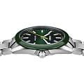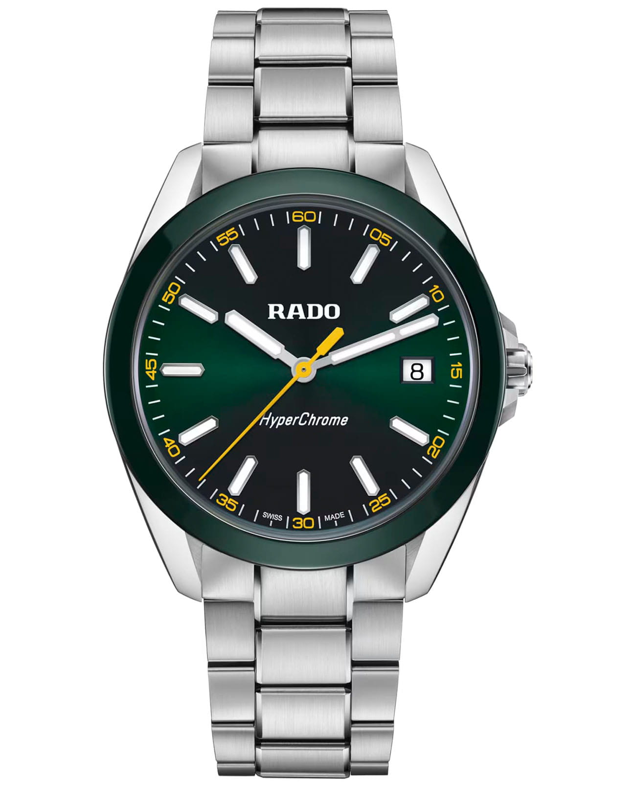 Мужские кварцевые часы Rado HyperChrome — это современное воплощение точности и мастерства материалов. Корпус диаметром 41,5 мм и толщиной 11,7 мм выполнен из полированной и матовой нержавеющей стали. БезельБезельВнешний ободок, закрепляющий стекло. В спортивных часах так называется поворотное кольцо с делениями на циферблате, выполняет роль таймера – замеряет отрезки времени на шкале. Неподвижный безель – элемент декора. Однонаправленно вращающийся безель на дайверских часах позволяет фиксировать моменты погружения и выныривания на поверхность. изготовлен из высокотехнологичной керамикиВысокотехнологичная керамикаИнновационный запатентованный Rado материал с гладкой или матовой поверхностью. Керамика за счёт кристаллической структуры обладает повышенной устойчивостью от возникновения царапин. Материал способен принимать температуру тела человека, обеспечивая невероятный комфорт при ношении. зелёного цвета, придающей часам прочность и изысканность. Циферблат зелёного цвета с лакированным покрытием оформлен индексами и стрелками с люминесцентным покрытиемЛюминесцентное покрытиеПозволяет считывать показания времени в темноте. Производители наносят на стрелки, часовые индексы, безель или поверхность циферблата светонакопительный состав, дающий холодное свечение. Super-Luminova®. Особенность подсветки — зелёное свечение метки 12 часов и минутной стрелки, и синее — остальных индексов и часовой стрелки, что обеспечивает интуитивное считывание времени в темноте. Циферблат защищён выпуклым сапфировым стекломСапфировое стеклоПрочный и надёжный материал из кристалла сапфира синтетического происхождения, характеризующийся особой твёрдостью и устойчивостью к царапинам и повреждениям. с антибликовым покрытиемАнтибликовое покрытиеСлой оксида металла в 0,13-0,3 микрон, благодаря которому стекло часов не бликует и не отражает свет. Антибликовое покрытие уменьшает отражение света в 10 раз, обеспечивая отличную читаемость показателей циферблата. на внутренней стороне. Механизм — кварцевый. Окошко даты расположено в положении 3 часов. Часы оснащены трёхрядным стальным браслетом с центральными звеньями и трёхсекционной застёжкой с системой быстрой регулировки. Водонепроницаемость 150 м позволяет использовать часы для плавания и повседневного ношения. Идеальный выбор для тех, кто ценит инновации, точность и смелый дизайн.