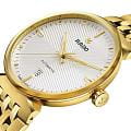 Универсальные механические часы с автоподзаводом Rado из коллекции Florence — это воплощение швейцарской точности и элегантности. Корпус диаметром 39 мм и толщиной 11 мм выполнен из нержавеющей стали с PVD-покрытиемPVDУльтратонкое покрытие наносится в технике вакуумного напыления, сочетает в себе нитрид титана особой прочности со слоем золота или оксида хрома. Несёт в себе декоративную или защитную функцию. жёлтого золота. Циферблат белого цвета с рельефным узором оформлен накладными индексами и подвижным якорем бренда — символом Rado. Циферблат защищён сапфировым стекломСапфировое стеклоПрочный и надёжный материал из кристалла сапфира синтетического происхождения, характеризующийся особой твёрдостью и устойчивостью к царапинам и повреждениям. с антибликовым покрытиемАнтибликовое покрытиеСлой оксида металла в 0,13-0,3 микрон, благодаря которому стекло часов не бликует и не отражает свет. Антибликовое покрытие уменьшает отражение света в 10 раз, обеспечивая отличную читаемость показателей циферблата., которое одновременно выполняет функцию безеляБезельВнешний ободок, закрепляющий стекло. В спортивных часах так называется поворотное кольцо с делениями на циферблате, выполняет роль таймера – замеряет отрезки времени на шкале. Неподвижный безель – элемент декора. Однонаправленно вращающийся безель на дайверских часах позволяет фиксировать моменты погружения и выныривания на поверхность.. Механизм — автоматический калибр R763 с пружиной Nivachron™Nivachron™Специально разработанный инновационный сплав Nivachron™ повышает устойчивость часов к воздействию магнитных полей., отрегулированный в пяти положениях, с запасом хода 80 часов. Окошко даты расположено в положении 3 часов. Завинчивающаяся коронка обеспечивает дополнительную защиту. Часы оснащены стальным браслетом с PVD-покрытиемPVDУльтратонкое покрытие наносится в технике вакуумного напыления, сочетает в себе нитрид титана особой прочности со слоем золота или оксида хрома. Несёт в себе декоративную или защитную функцию. жёлтого золота и застёжкой «бабочка» с кнопкамиЗастёжка "бабочка"Такой вид застёжки дополняется предохранителями, помогающими избежать случайного раскрытия браслета. Обладают изящным исполнением. из нержавеющей стали. Водонепроницаемость 50 м позволяет использовать часы в повседневных условиях. Идеальный выбор для тех, кто ценит мастерство, стиль и универсальность.