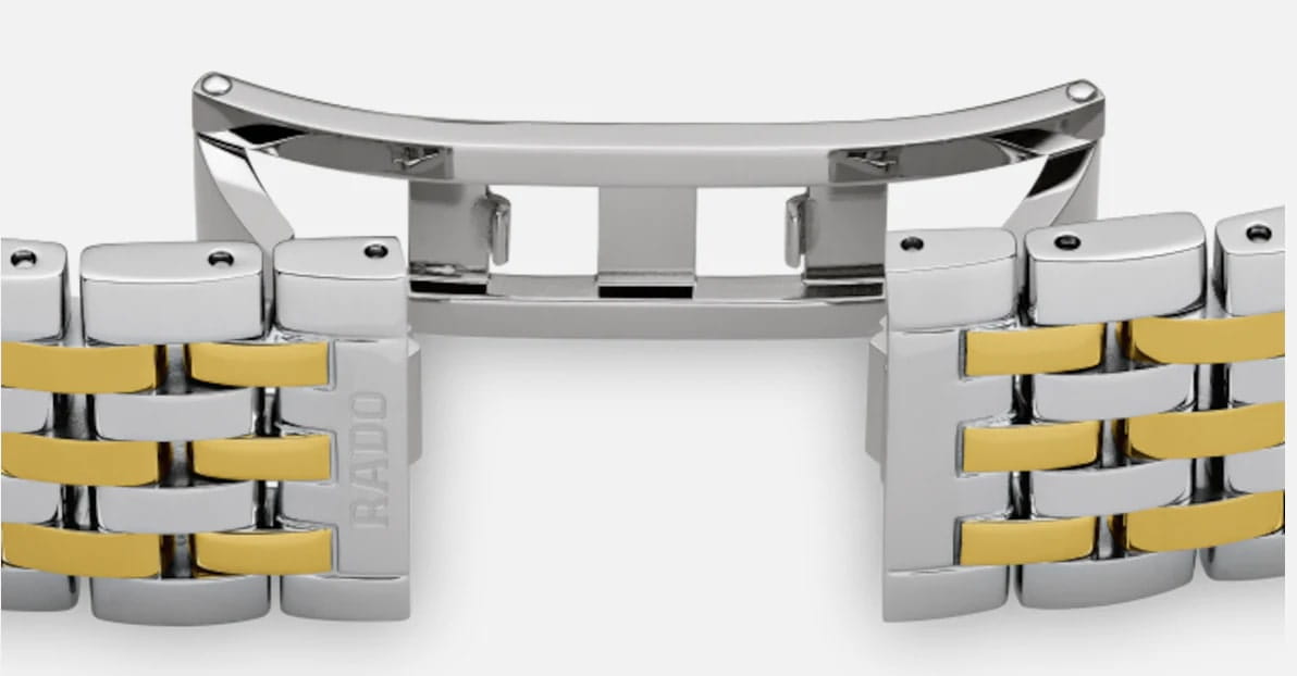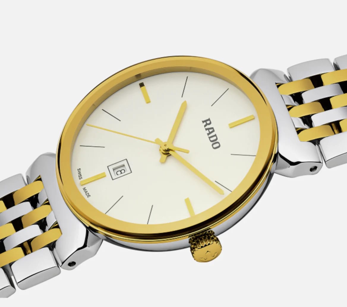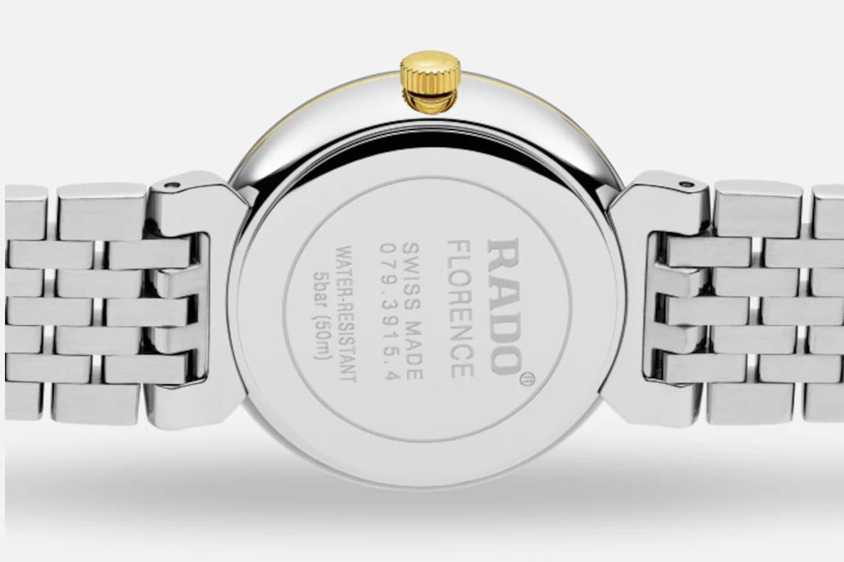 Женские швейцарские кварцевые часы Rado Florence Classic R48913023, кварцевый механизм с высокой точностью. Циферблат с сапфировым стекломСапфировое стеклоПрочный и надёжный материал из кристалла сапфира синтетического происхождения, характеризующийся особой твёрдостью и устойчивостью к царапинам и повреждениям. устойчивым к появлению царапин, обладающее высокой прозрачностью. Класс водозащиты: 50 метров, позволит защитить корпус от случайных брызг или капель дождя. Корпус часов изготовлен из стали. БезельБезельВнешний ободок, закрепляющий стекло. В спортивных часах так называется поворотное кольцо с делениями на циферблате, выполняет роль таймера – замеряет отрезки времени на шкале. Неподвижный безель – элемент декора. Однонаправленно вращающийся безель на дайверских часах позволяет фиксировать моменты погружения и выныривания на поверхность. с PVD-покрытиемPVDУльтратонкое покрытие наносится в технике вакуумного напыления, сочетает в себе нитрид титана особой прочности со слоем золота или оксида хрома. Несёт в себе декоративную или защитную функцию.. Стальной браслет на застёжке-бабочке с кнопкамиЗастёжка "бабочка"Такой вид застёжки дополняется предохранителями, помогающими избежать случайного раскрытия браслета. Обладают изящным исполнением. с частичным PVD-покрытиемPVDУльтратонкое покрытие наносится в технике вакуумного напыления, сочетает в себе нитрид титана особой прочности со слоем золота или оксида хрома. Несёт в себе декоративную или защитную функцию..