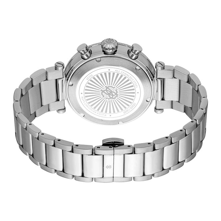 Roberto Cavalli Ritmo RC5G128M0055 — мужская кварцевая модель с ярко выраженным спортивным стилем и практичным функционалом, сочетающая строгий дизайн и надёжность. Корпус диаметром 43 мм и толщиной 12 мм выполнен из нержавеющей стали, защищён прочным минеральным стекломМинеральное стеклоМинеральное стекло представляет собой искусственно выращенный минерал кварца. Такое стекло отличается особой устойчивостью к повреждениям и царапинам. Уступает по некоторым качествам сапфировому стеклу., устойчивым к повседневным повреждениям и сохраняющим хорошую читаемость циферблата. БезельБезельВнешний ободок, закрепляющий стекло. В спортивных часах так называется поворотное кольцо с делениями на циферблате, выполняет роль таймера – замеряет отрезки времени на шкале. Неподвижный безель – элемент декора. Однонаправленно вращающийся безель на дайверских часах позволяет фиксировать моменты погружения и выныривания на поверхность.. Водозащита 100 м делает часы надёжным спутником во время плавания и активного отдыха. Функциональность поддерживается индикаторами хронографаХронографФункция позволяет измерять отрезки времени с особой точностью: часы, минуты, секунды. Верным признаком хронографа является наличие на циферблате 3 дополнительных окошек-счётчиков. и даты, которые органично вписаны в оформление циферблата. Стальной браслет на застёжке-бабочке с кнопкамиЗастёжка "бабочка"Такой вид застёжки дополняется предохранителями, помогающими избежать случайного раскрытия браслета. Обладают изящным исполнением. обеспечивает комфортную посадку и долговечность, а также гармонично завершает образ модели, которая одинаково хорошо подойдёт как для динамичного повседневного ритма, так и для более строгих ситуаций.