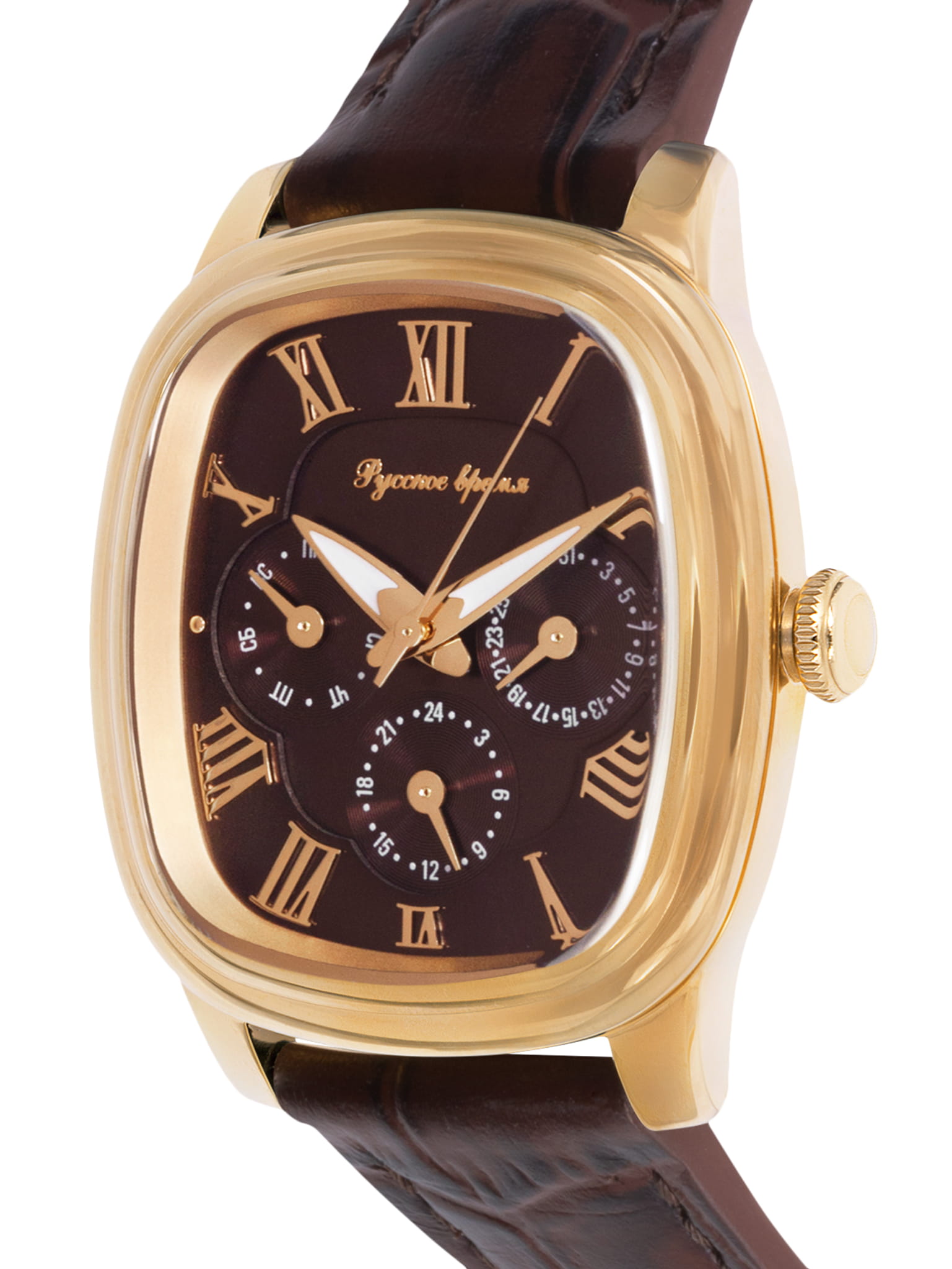 Русское время 3516052 — это мужские часы с классическим дизайном, сочетающие функциональность и стиль. Корпус диаметром 41 мм выполнен из нержавеющей стали с PVD-покрытиемPVDУльтратонкое покрытие наносится в технике вакуумного напыления, сочетает в себе нитрид титана особой прочности со слоем золота или оксида хрома. Несёт в себе декоративную или защитную функцию., что придаёт часам прочность и долговечность. Циферблат с чёткими метками и стрелками, покрытыми люминесцентным покрытиемЛюминесцентное покрытиеПозволяет считывать показания времени в темноте. Производители наносят на стрелки, часовые индексы, безель или поверхность циферблата светонакопительный состав, дающий холодное свечение., обеспечивает удобство чтения в темноте. Окошко даты расположено на отметке «3 часа» для удобства. Минеральное стекло защищает циферблат от царапин, а водонепроницаемость до 50 метров позволяет носить часы в повседневной жизни, не беспокоясь о сохранности механизма. Часы оснащены кварцевым механизмом, что гарантирует точность хода. Ремешок выполнен из натуральной кожи, что придаёт часам изысканный вид и комфорт при носке.