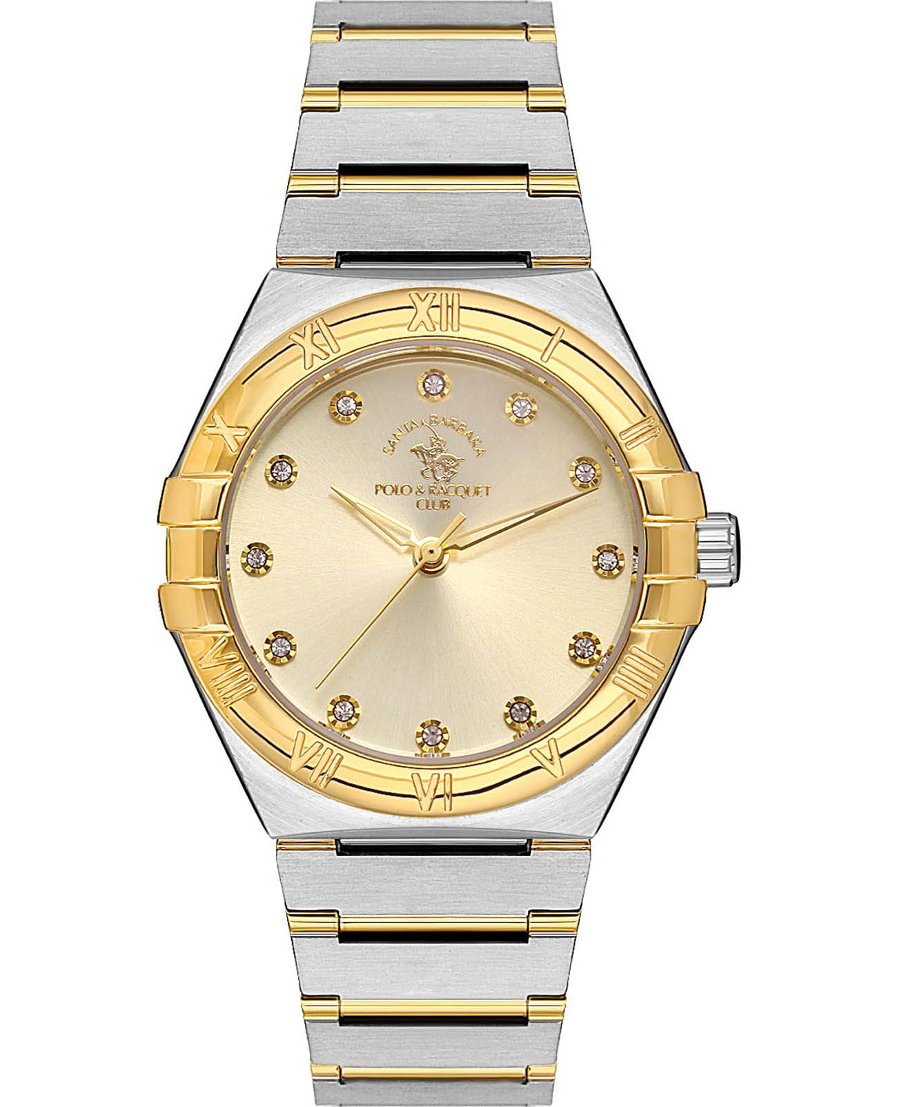 Женские кварцевые часы Santa Barbara Polo & Racquet Club — это элегантный аксессуар, притягивающий восхищённые взгляды. Корпус диаметром 34 мм и высотой 36 мм выполнен из нержавеющей стали. БезельБезельВнешний ободок, закрепляющий стекло. В спортивных часах так называется поворотное кольцо с делениями на циферблате, выполняет роль таймера – замеряет отрезки времени на шкале. Неподвижный безель – элемент декора. Однонаправленно вращающийся безель на дайверских часах позволяет фиксировать моменты погружения и выныривания на поверхность. с IP-покрытиемIP-покрытиеМетод ионного напыления. Демонстрирует повышенную устойчивость к истиранию, окислению и химическим веществам. Под воздействием высокого давления и температуры около 1500°C молекулы металла надёжно соединяются с частицами корпуса часов. оформлен римскими цифрами, придавая дизайну классическую выразительность. Циферблат золотистого цвета выполнен по технологии Sunray («солнечные лучи»), дополнен накладными метками в виде точек, инкрустированных кристаллами, а также фирменным логотипом. Циферблат защищён минеральным стекломМинеральное стеклоМинеральное стекло представляет собой искусственно выращенный минерал кварца. Такое стекло отличается особой устойчивостью к повреждениям и царапинам. Уступает по некоторым качествам сапфировому стеклу.. Механизм — кварцевый калибр Miyota 2035. Часы оснащены стальным браслетом с частичным IP-покрытиемIP-покрытиеМетод ионного напыления. Демонстрирует повышенную устойчивость к истиранию, окислению и химическим веществам. Под воздействием высокого давления и температуры около 1500°C молекулы металла надёжно соединяются с частицами корпуса часов. и раскладной застёжкойРаскладная застёжкаТакой тип застёжки используется только на браслетах из металла. Она никогда не раскрывается полностью, происходит разделение на 2 и более частей. Раскладывающая застёжка снизит вероятность потери часов к минимуму.. Водонепроницаемость 50 м позволяет использовать часы в повседневных условиях. Идеальный выбор для тех, кто ценит блеск, стиль и качество.