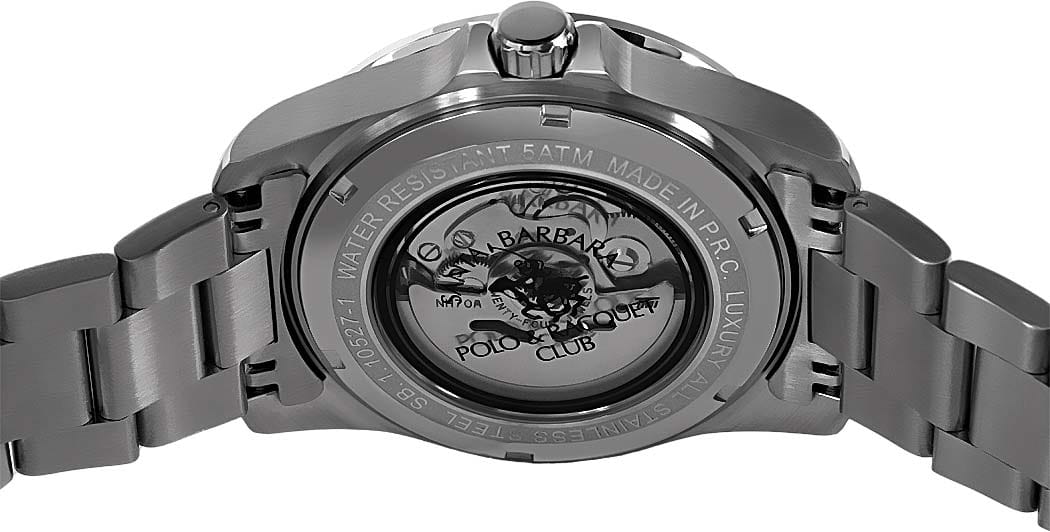 Мужские механические часы с автоподзаводом Santa Barbara Polo & Racquet Club — это эффектный аксессуар с оригинальным дизайном. Корпус диаметром 42 мм и высотой 49,5 мм выполнен из стали. Циферблат серебристого цвета частично скелетонизирован, что позволяет наблюдать за работой механизма. Двухуровневый циферблат украшен накладными метками в виде точек и фирменным логотипом. Стрелки и метки с люминесцентным покрытиемЛюминесцентное покрытиеПозволяет считывать показания времени в темноте. Производители наносят на стрелки, часовые индексы, безель или поверхность циферблата светонакопительный состав, дающий холодное свечение., обеспечивающим хорошую читаемость в темноте. Циферблат защищён минеральным стекломМинеральное стеклоМинеральное стекло представляет собой искусственно выращенный минерал кварца. Такое стекло отличается особой устойчивостью к повреждениям и царапинам. Уступает по некоторым качествам сапфировому стеклу.. Прозрачная задняя крышка открывает вид на механизм. Часы оснащены стальным браслетом с раскладной застёжкойРаскладная застёжкаТакой тип застёжки используется только на браслетах из металла. Она никогда не раскрывается полностью, происходит разделение на 2 и более частей. Раскладывающая застёжка снизит вероятность потери часов к минимуму.. Водонепроницаемость 50 м позволяет использовать часы в повседневных условиях. Идеальный выбор для тех, кто ценит технологичность, стиль и выразительность.